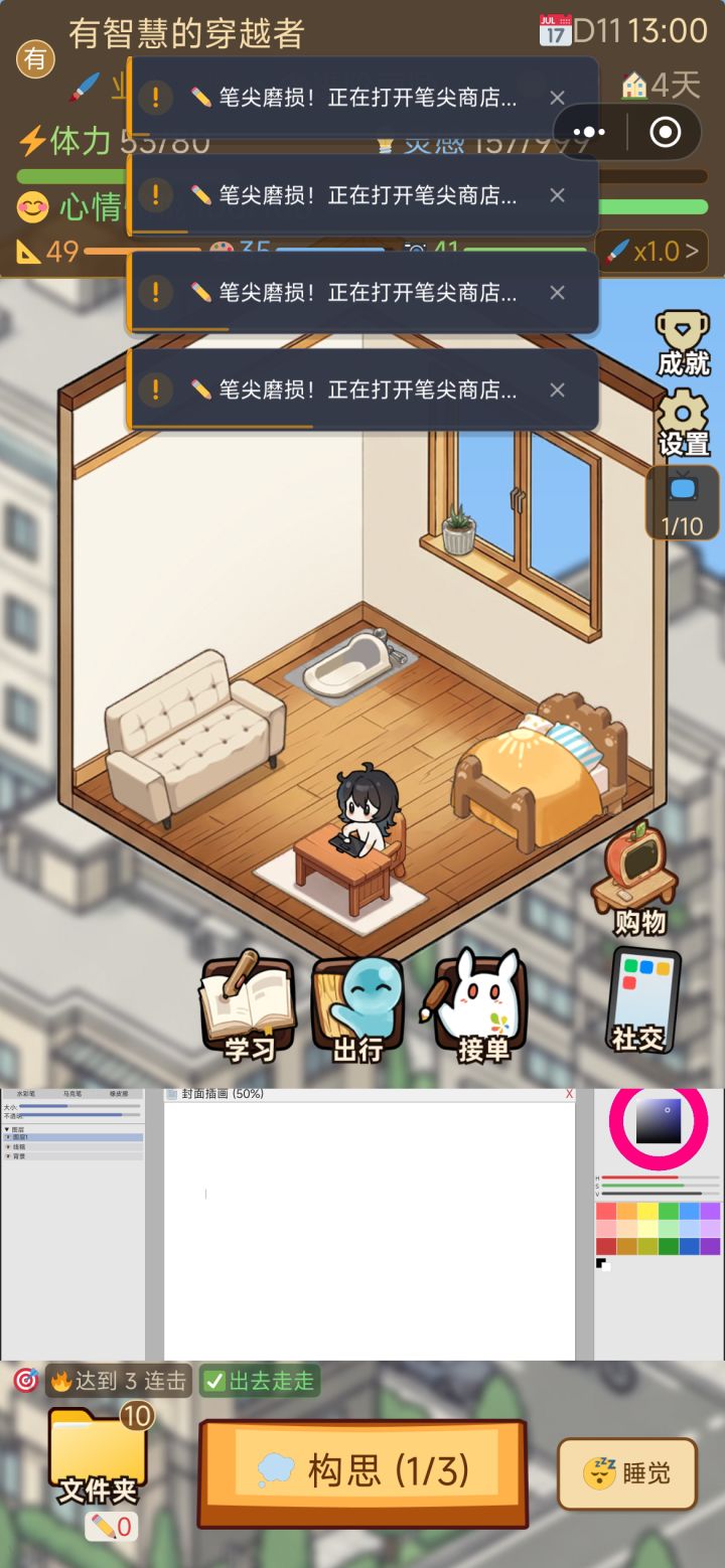 玩了档简单开局感觉难度还行就又试了试天崩开局,结果刚点上睡觉就弹结局了这十天一直在速写+接单轮换着来,灵感跟心情全靠家具回复,每天都是消耗到个位数体力心情才休息,然后就成这样了