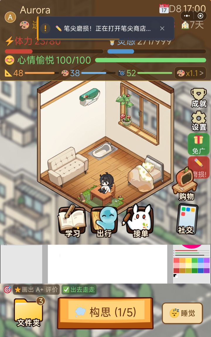 玩了档简单开局感觉难度还行就又试了试天崩开局,结果刚点上睡觉就弹结局了这十天一直在速写+接单轮换着来,灵感跟心情全靠家具回复,每天都是消耗到个位数体力心情才休息,然后就成这样了