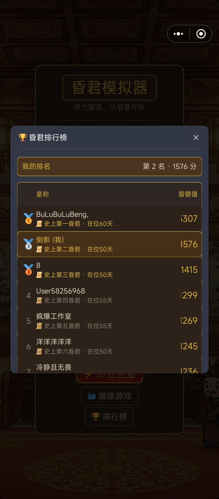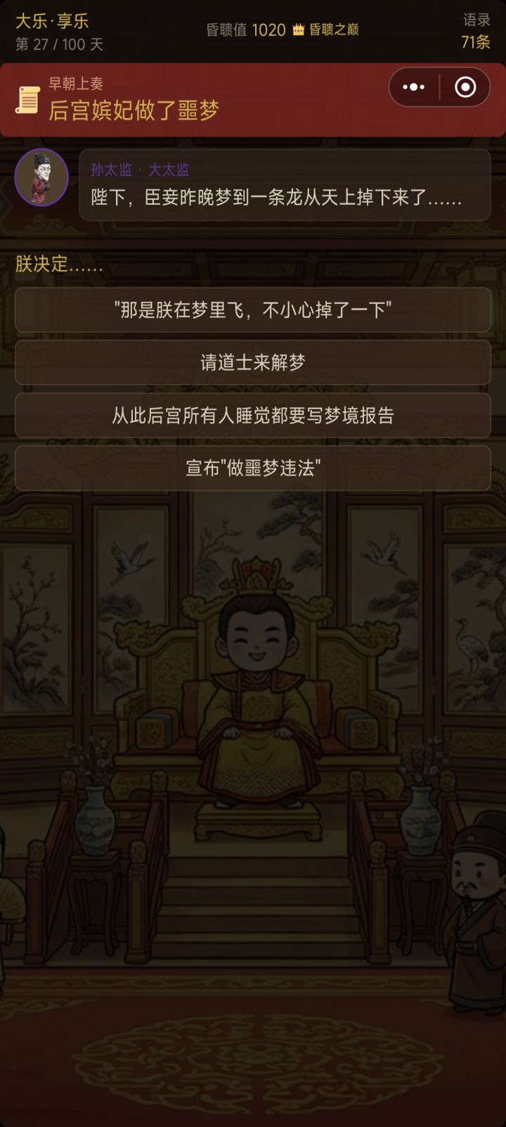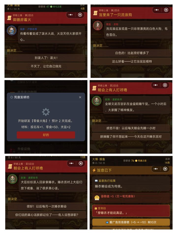 还不错,有点小Bug,页面没办法往下滑之类的。还有可玩性可以更高一点,比如可以逐步解锁更荒唐的,还有希望有选妃之类的增加后宫数量,以及能够科举招人,还有打仗之类的。