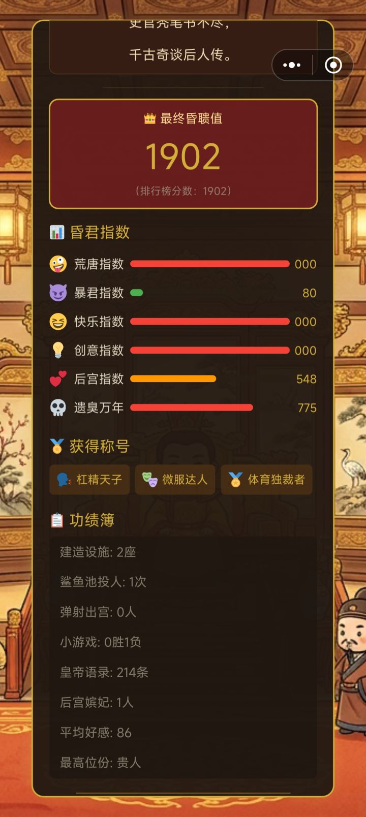 这是一个很有意思的游戏,玩的时候会为其中的荒谬而觉得好笑,后宫的妃子相对应的好感也能够解锁故事,还有密道探索什么。就是觉得有些太过荒谬的选择,其实不想选,但是只有这个选择,于是被迫选择一个。
