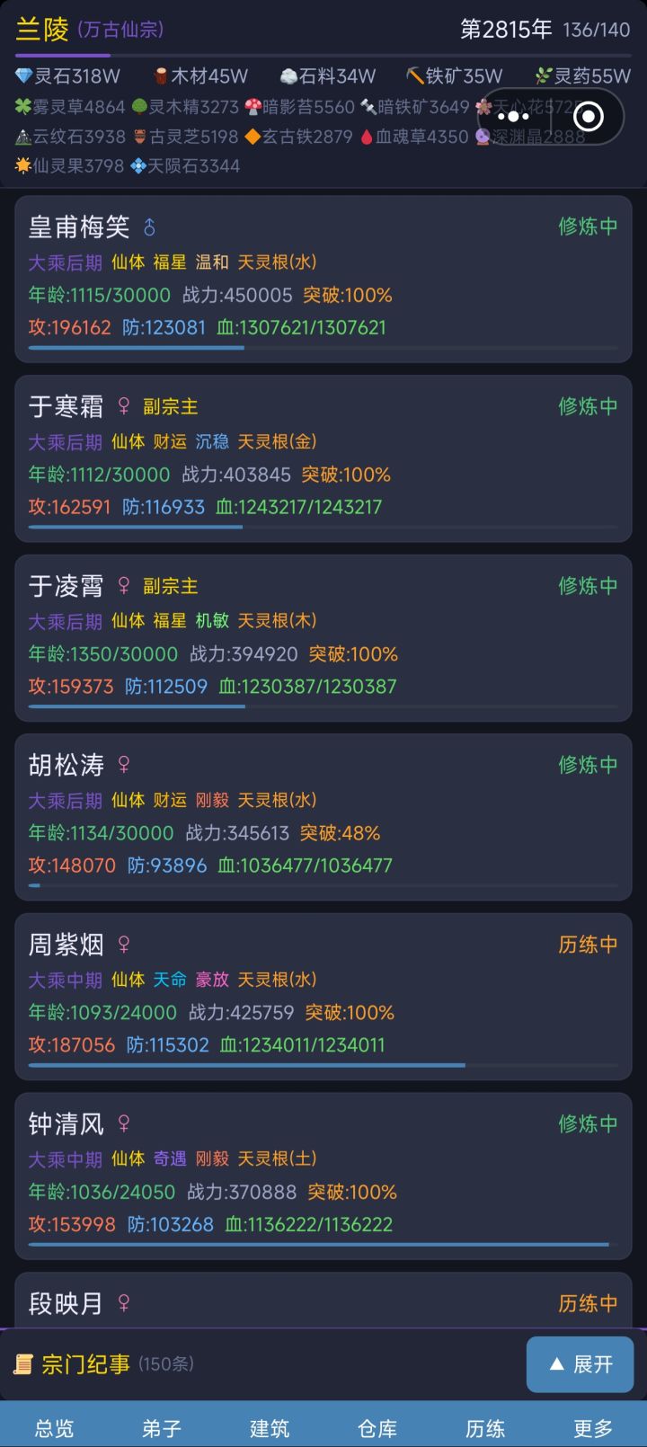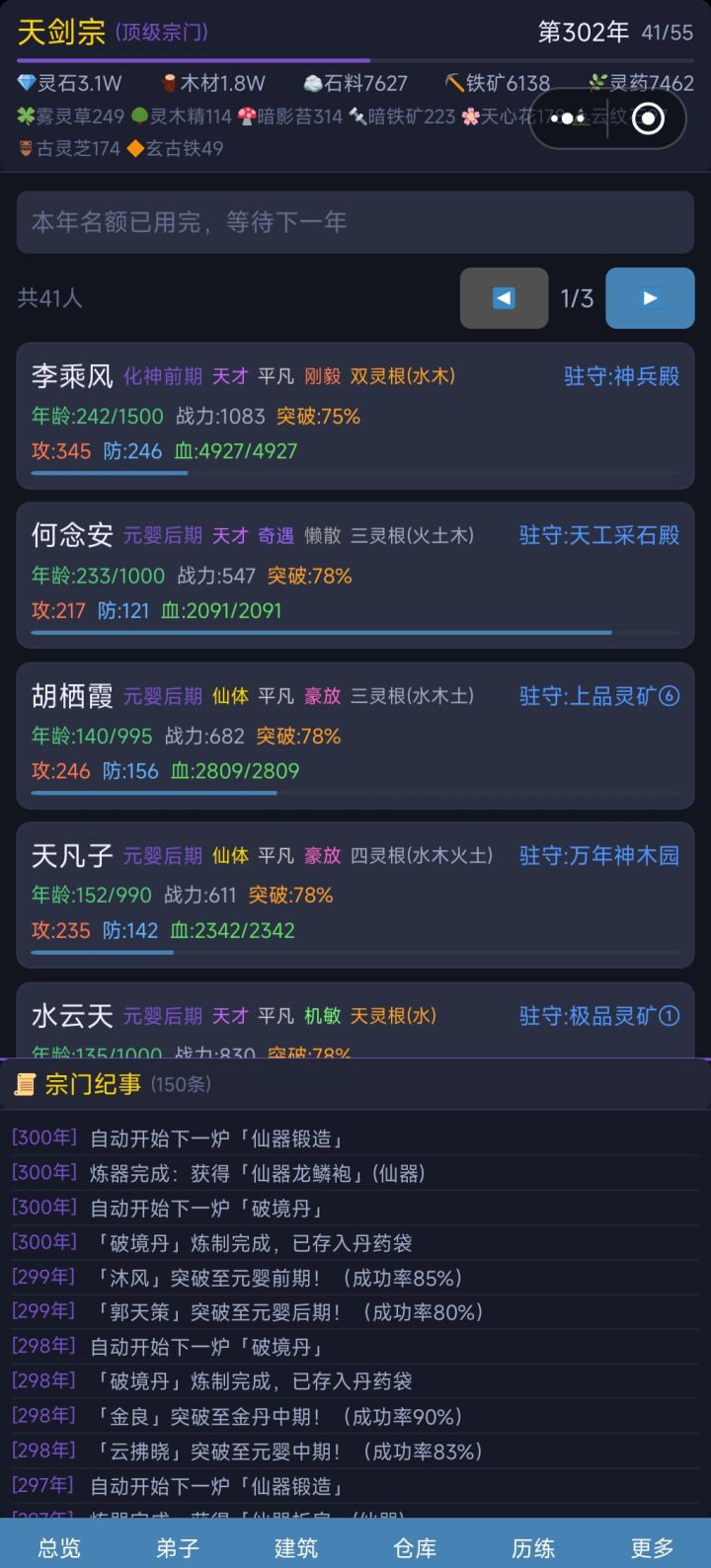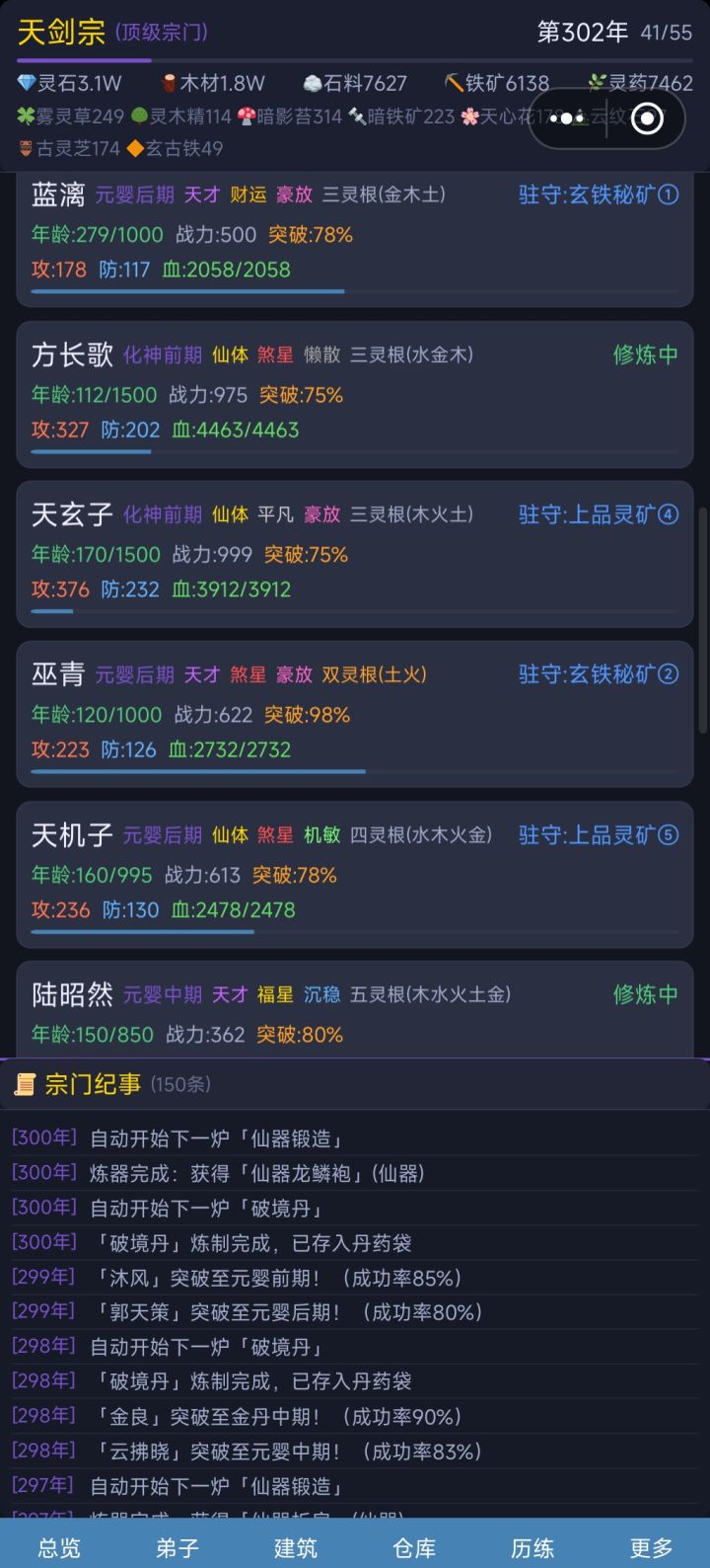 【系统改动】1.弟子驻守时可以修炼但不受加成影响2.宗门人数限制703.弟子突破会回满血,每年自动回复10%HP4.·修炼加成建筑总加成上限800%5.建筑选择弟子时显示具体加成6.装备使用隐藏规则改为对比数值而非检查已有装备7.弟子突破成功率调整:练气初始100%,境界越高越低,最低40%8.历练死亡惩罚修改:同大境界按原概率,超出条件大境界时死亡率为0,炼丹和炼器材料改为历