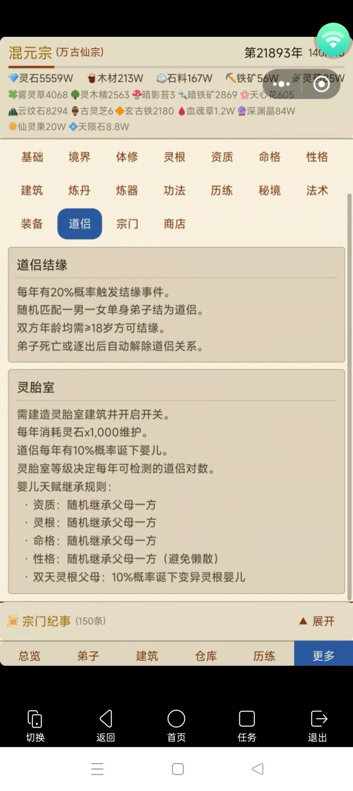 把其他弟子全踢了,只留俩个天灵根一男一女(如果男女比例不对,可以在更多商店里面选择买阴阳丹转换性别),在打开建筑建设培育室,开启,这时,只要等这两个天灵弟子结为道侣,然后就可以生孩子,(记住了,一定要把两个片名跟弟子体质刷成仙体,命格刷福星,性格可以豪放,沉稳因为豪放.沉稳有修练加成)因为现在孩子是继承父母的,所以当天灵根两个弟子生出小孩子刷出来混沌灵根的时候,你就会得到,(混沌灵根,仙体,福星,