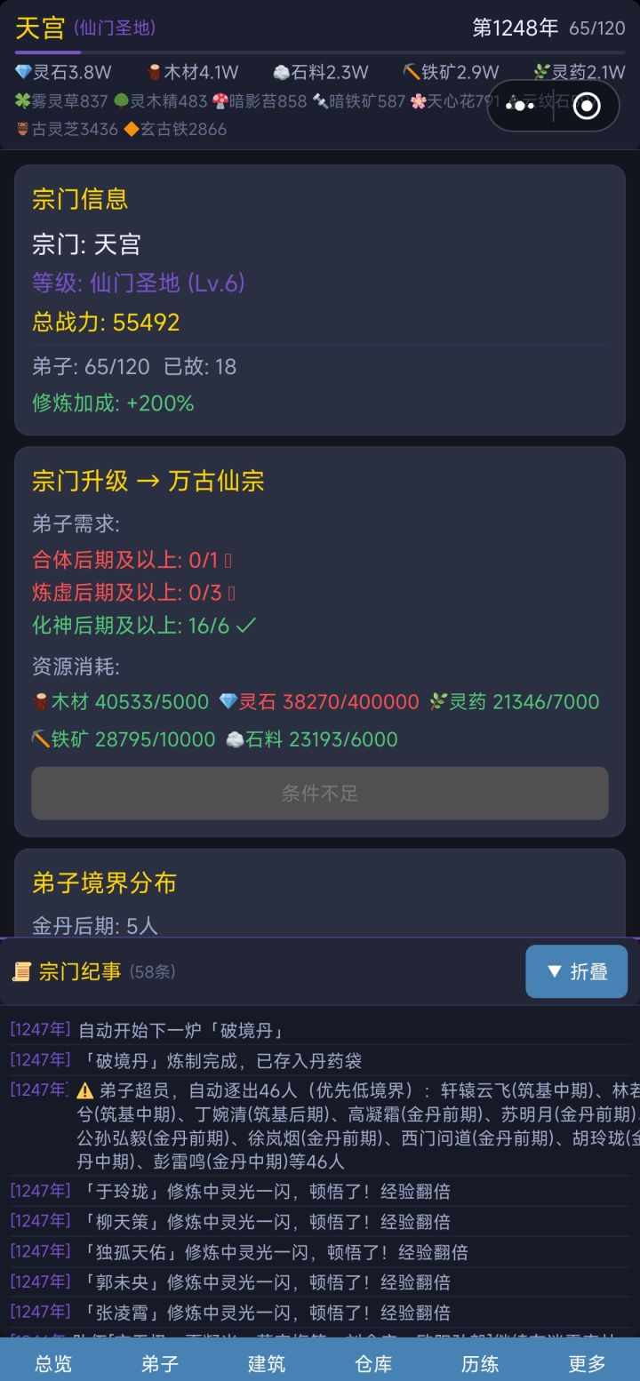 【系统改动】1.弟子驻守时可以修炼但不受加成影响2.宗门人数限制703.弟子突破会回满血,每年自动回复10%HP4.·修炼加成建筑总加成上限800%5.建筑选择弟子时显示具体加成6.装备使用隐藏规则改为对比数值而非检查已有装备7.弟子突破成功率调整:练气初始100%,境界越高越低,最低40%8.历练死亡惩罚修改:同大境界按原概率,超出条件大境界时死亡率为0,炼丹和炼器材料改为历