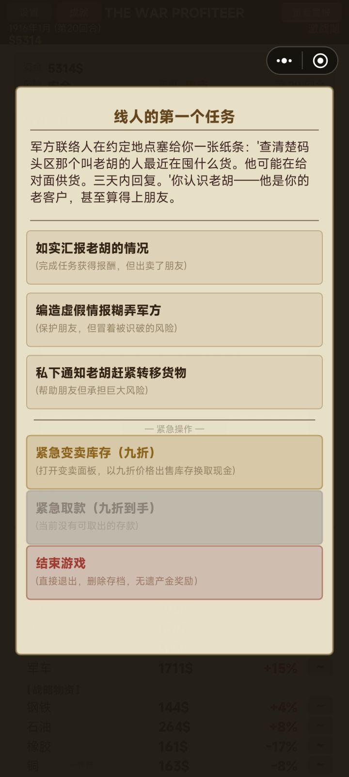 说实话期货太超标了,前面只需要凑够25w,后面除了激战其他时候全都无脑期货2中2就行了,一般民用物资和烟草全都赌-15~25就行了,基本输不了,每次用百分之20资金,一回合翻一倍几十回合下去就天文数字了