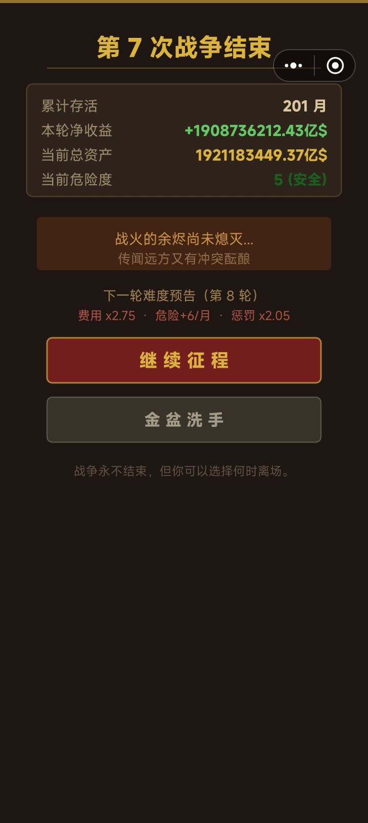 开局只要不是爆发,就全买军车赌下一场战争涨价(和平开局最好)梭哈,然后用钱买信息然后就赌,他是真的再梭哈,就要赌对了,前面最难的就过去了。十到二十回合搞好感(军队和政治)然后只开军队的联盟,仓库有东西卖不了的时候多开个政治的。紧张到爆发就搞车和炸,僵持到和平就搞黄金(有钱搞房子)当和平直接跳战争房子就租出去(建议4-6个月)黄金就干等二十到三十回合求稳存银行搞好感刷名声最后在四十八回合到来前