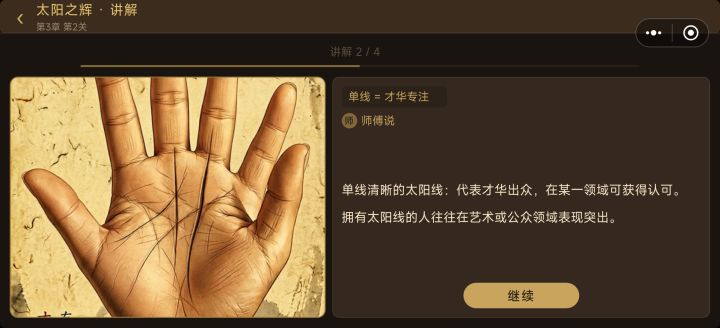 已通关,这是一款很有趣的国学类科普游戏!我觉得这是一款很有潜力的游戏,它把手相的基础大致的给玩家过了一遍。但是手相是一个很硬核的学问,希望官方能继续更新,完善一下游戏后面的内容。例如增加手纹对应的应期,手指的形状和纹路(指缝,夫子眼等),主线的分叉(例如凤尾纹,坎鱼纹等),杂纹的组合判断等等教学。相信这款游戏能够成为最好的手相科普游戏!