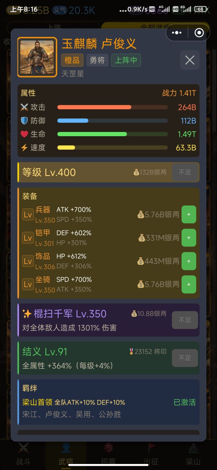 玩2天了,第一天榜50,2转30,第二天3转进10,基本刷到头了,抽卡20000个全橙色,目前这个设计上只刷卢俊义就够了,反正我其他的都不加,可以比较无脑,省心,可能手机有点老,刷半个小时就有点卡了,希望作者优化下