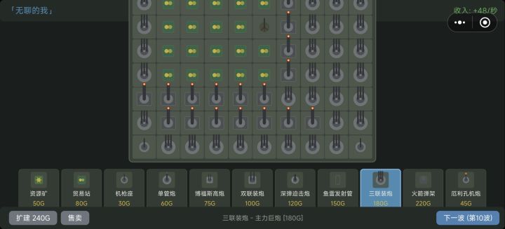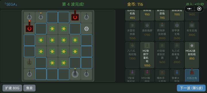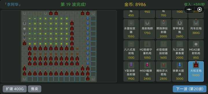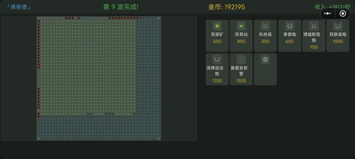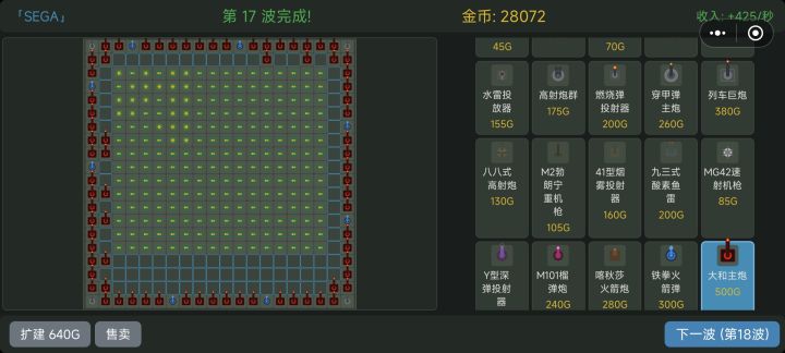 大约15波以后就没什么战斗压力了,扩建个几级,然后全部都换上大和炮,站着不动就能干掉所有怪,也包括BOSS。没有做养成设定,能变强的方式就是批量堆最终炮塔。