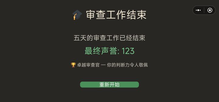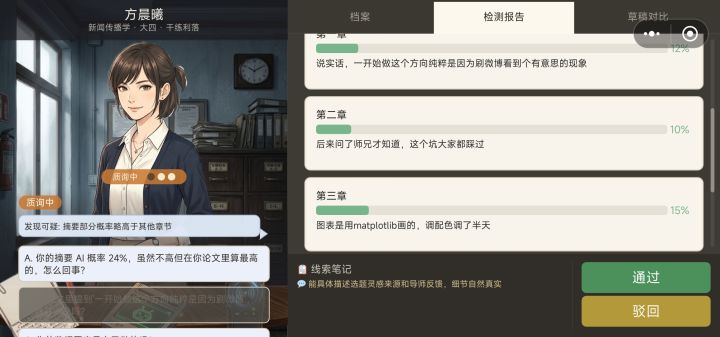 游戏整体体验所需时长较短(10-20min),内容简明扼要,就是检阅论文,驳回AI答卷。相比其它同类型游戏(包括伪人游戏),该游戏整体难度较低,花点心思做出判断就行。游戏提示丰富,领域覆盖不多但不缺乏专有名词,难度阶梯平稳。第五天(最后一天)的聪明学生使用AI模型进行论文思路指导梳理的例子引人深思,是该游戏作者的思维升华(通过驳回都对)。正是因为现实仍有太多类似的“灰色”论文,AI论文判别的工作依然任重道远。