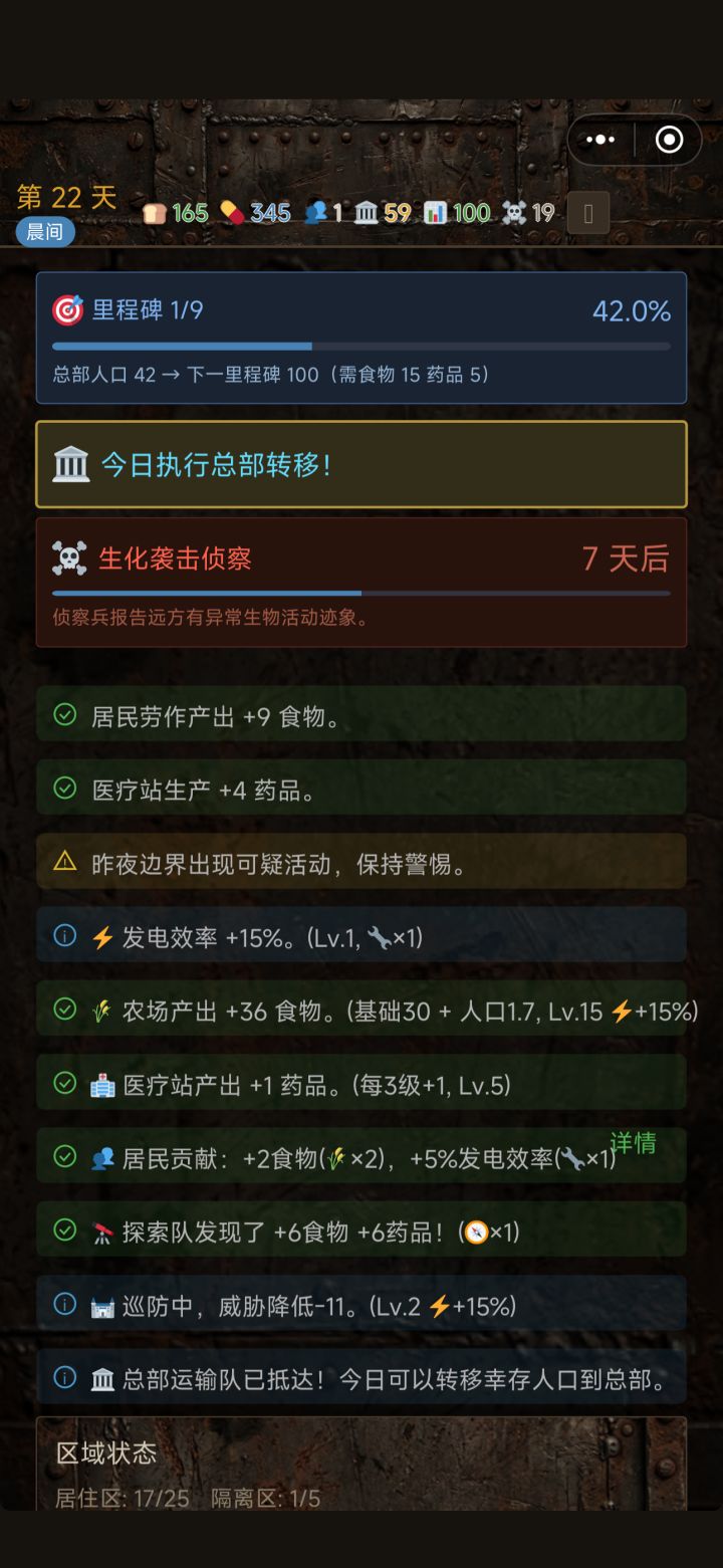 防守没数值大概对比只能积攒粮食堆满炮台。医院的作用是啥没看出来。探索属于碰运气。虽然有各种职业规划但没看出作用,是不是收容治疗过某职业可以在其对应项目上加点?比如收留过农民种植就加点微弱属性。可改善空间挺大的