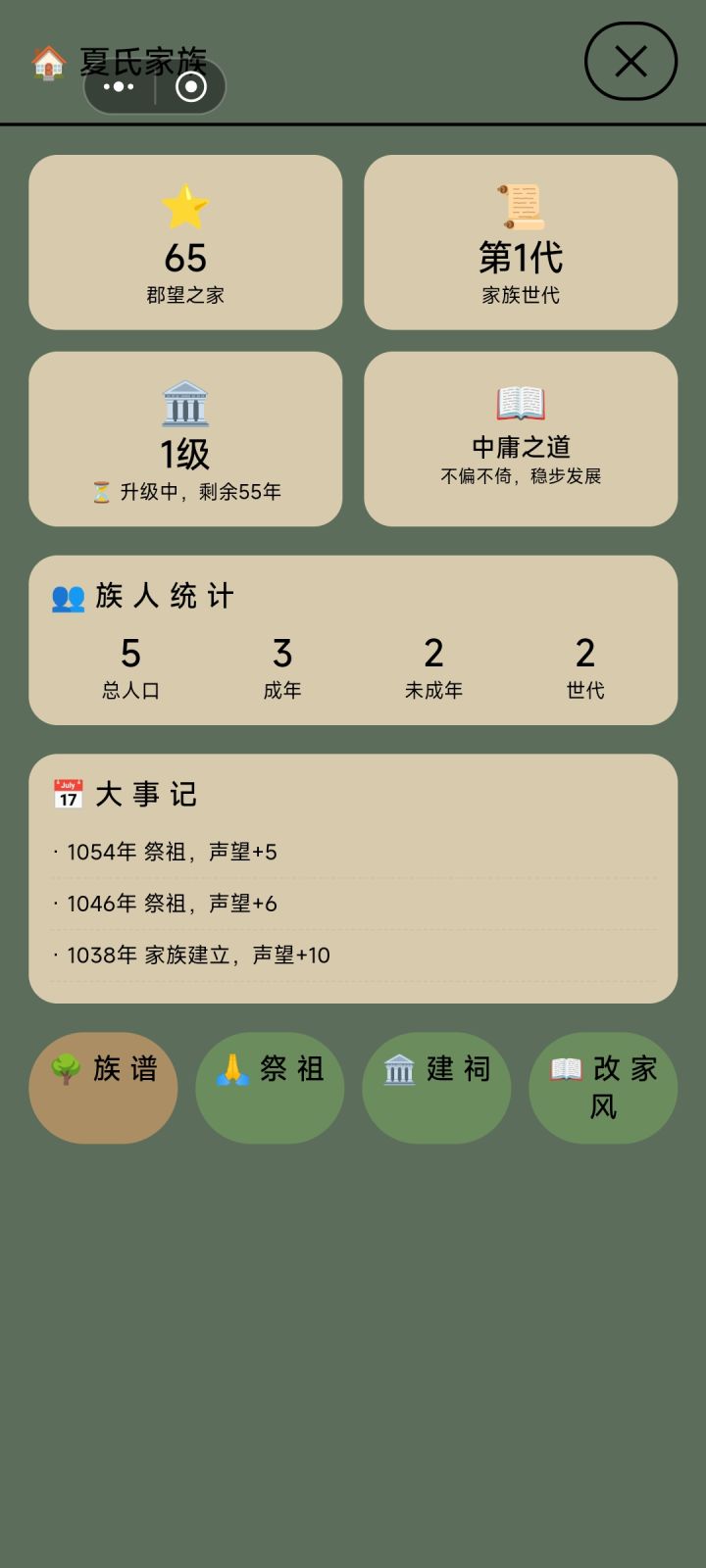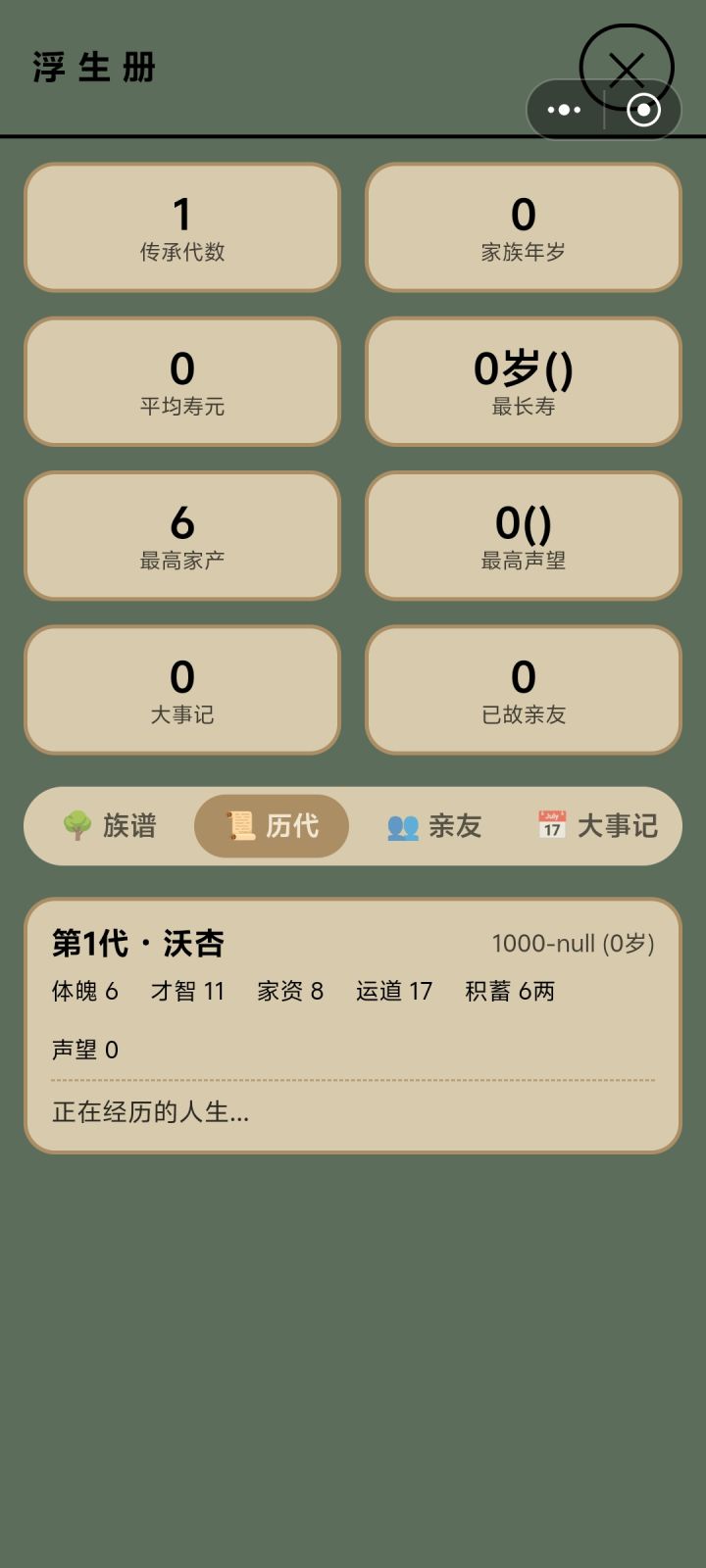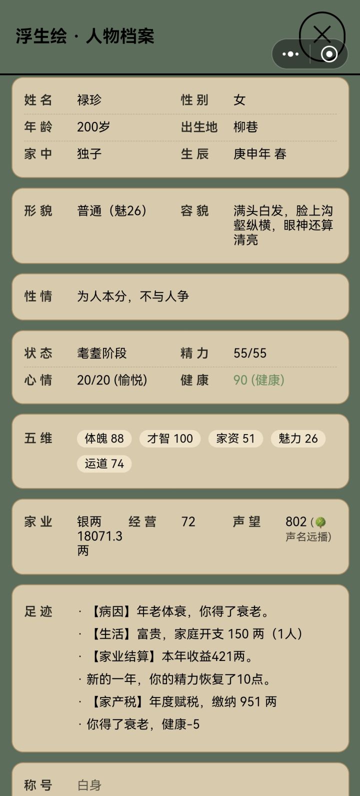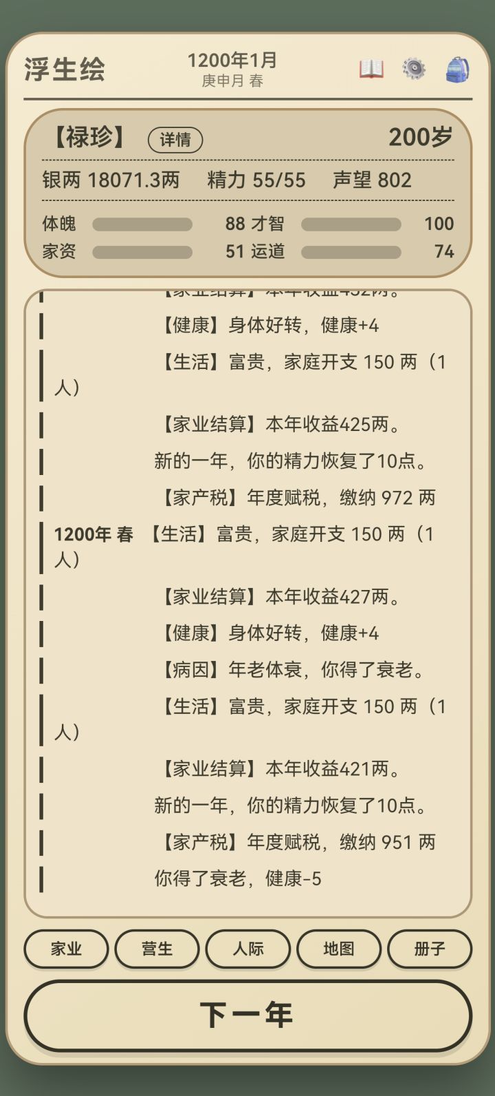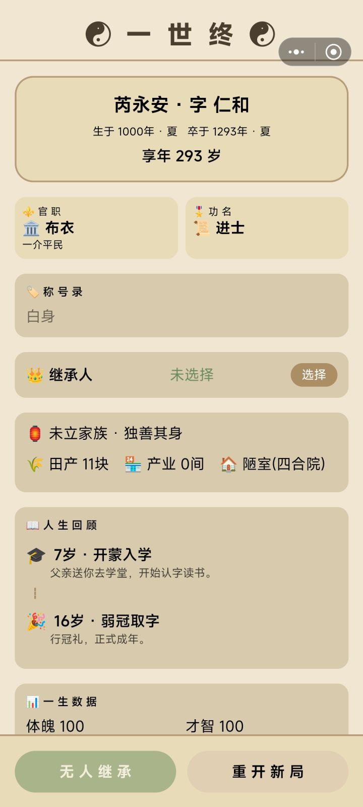 图一,选文官路线。公务花钱但不加政绩和民心。另挪用公款后可以把自己钱还进去,可以增加大量可用资金,不知是bug还是机制图二,重开新号,但是家族祭祀还是上一个号的,并且仍然可以用。且等级不能升为2级,无论是第一个号还是第二个图三,探索只能探索一次。第一个号十几岁探索一次,之后一直不能探索。第二个号直接一次都不行图四,金疮药说加30~50健康值,实际只加十几后代名字没有,且点击后无交互,不能传