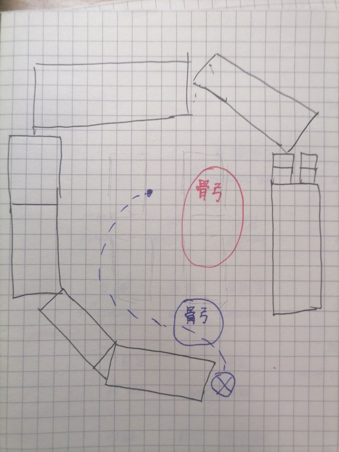 整个地图是一圈车子围住,骨弓是远程不会靠近,利用一点点的场景角度就可以赖骨弓 骨弓在红圈位置, 遵循蓝色虚线,移动至蓝叉位置, 骨弓此时会处于蓝色圈位置。 利用凸出的小角挡住他的远程, 用弓箭频繁右移一点点赖他 ★★★注意: 红色圈为骨弓刚开始所在的地方 蓝色圈为诱导后,骨弓所在地方 蓝色叉圈为玩家以后的位置 蓝色虚线为玩家引诱路线(大致 进入场景后,骨弓会立刻发现你并对你进行追杀,需要向左上角走
