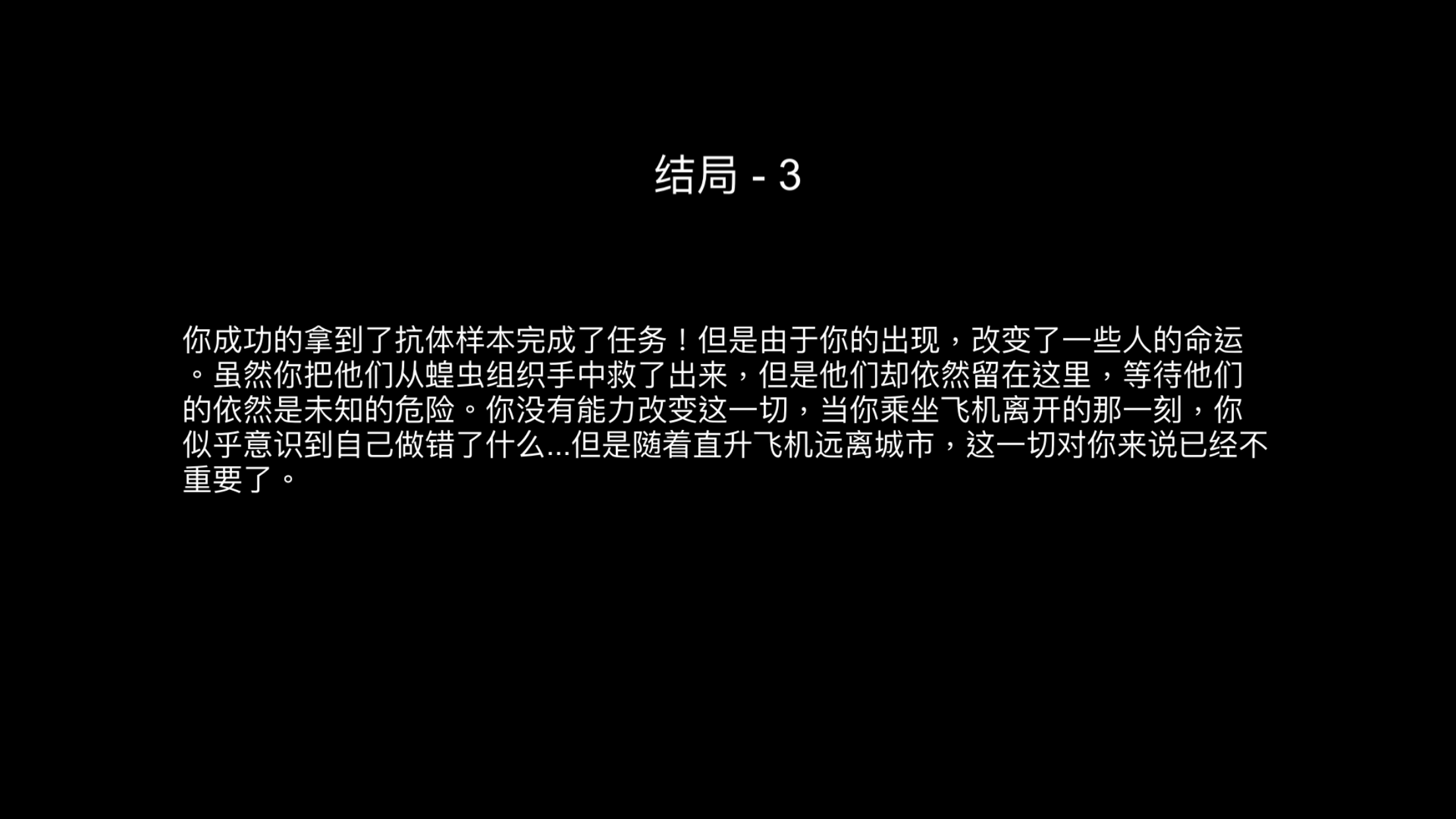 结局一打到飞机直接走。结局二我是救了一个人在走结局三是全救结尾附装备图自此全部打完