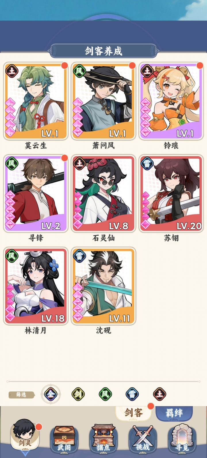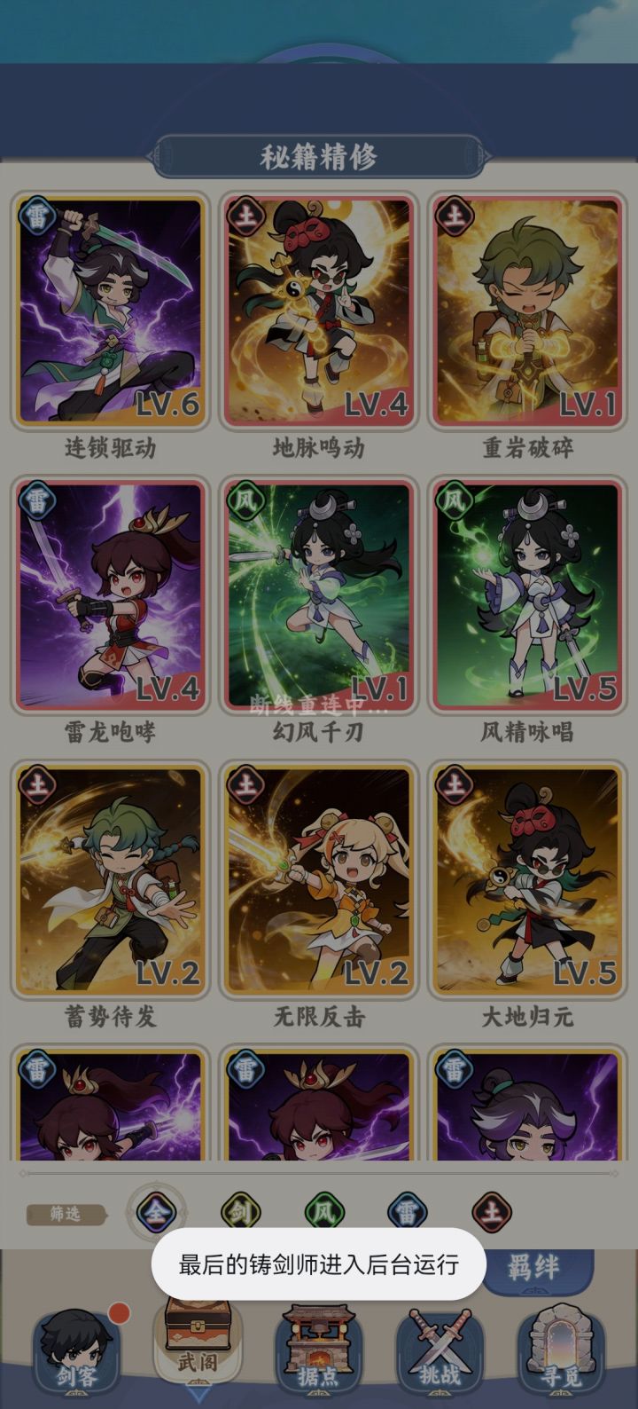 #寻找最强铸剑师 土属性:土属性目前大体来说分两种玩法第一种是土流盾+震荡波+反罡震的纯乌龟流,优点是确实不会被打死,最肉的没有之一,缺点是遇到任何土都互相杀不死,并不是很推荐;第二种如图一,震荡波+蓄力斩+土流盾的瞬斩流,原理为SSR土角色被动:战斗开始99%血量转化为22层护盾,配合霸体刻印,可以避免被风起手控的同时,完美全程吃上武器词条狂战的BUFF(血量50%以下增加40%攻击力)