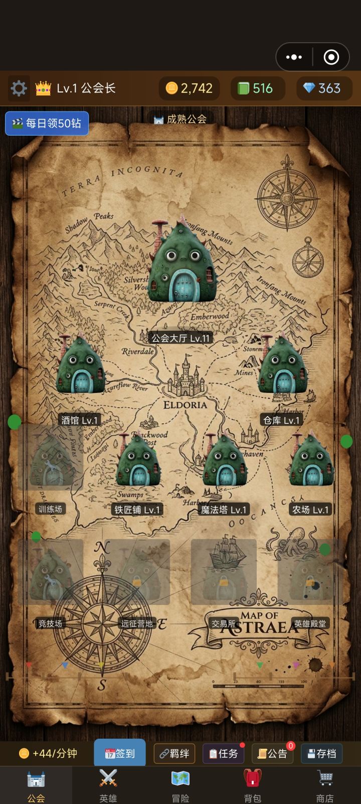 这款小游戏的全维度测评✨ 从画面、玩法、体验、优缺点等方面给你做个全面拆解: 一、美术与UI设计:复古氛围感拉满 1. 核心亮点:游戏的「复古藏宝图」主界面是最大的视觉亮点,泛黄羊皮纸纹理+手绘线稿地图+指南针元素,把中世纪奇幻世界的探险感做足了,风格统一且辨识度很高。2. 细节加分:地图上的锁图标、公会建筑的卡通化设计,和整体复古画风形成反差萌,不会让界面显得过于厚重;底部