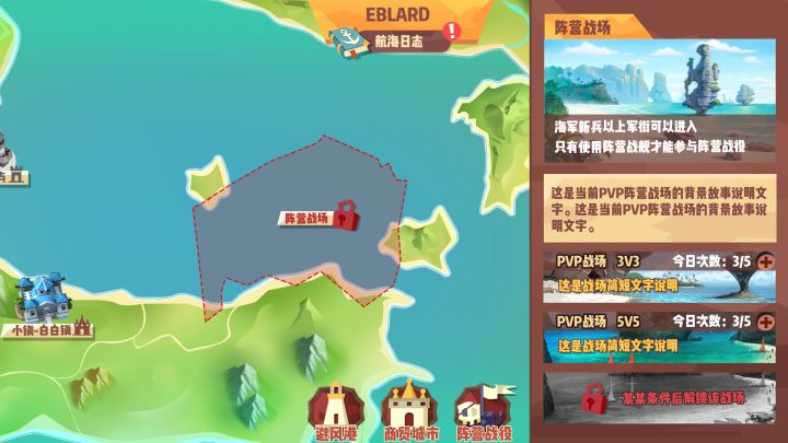 各位新老朋友大家好,我是开发老王,本周有两个重要的好消息,一是之前大家非常关注的阵营玩法有了新的开发进展;二是我们为了让游戏更有趣味性,研究出了升级原有的海域3星奖励功能的方案。这两个项目都能让玩家得到更优质的游戏体验,本身也是航海MMORPG爱好者的我们工作的时候也非常振奋!下面就来给大家分享一下~阵营玩法:调整之后的阵营战场功能会以战区的形式呈现,直接整合进了世界地图,玩家只需要进入世界