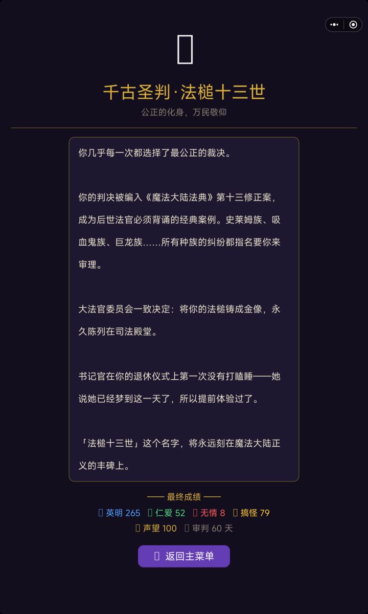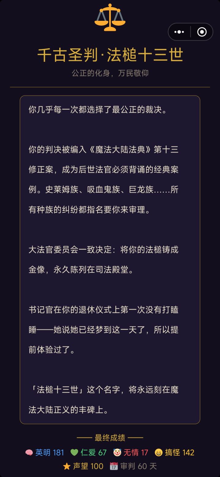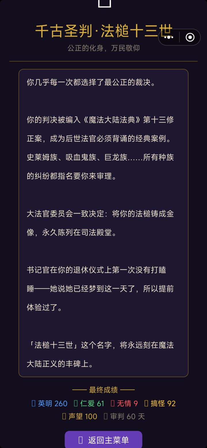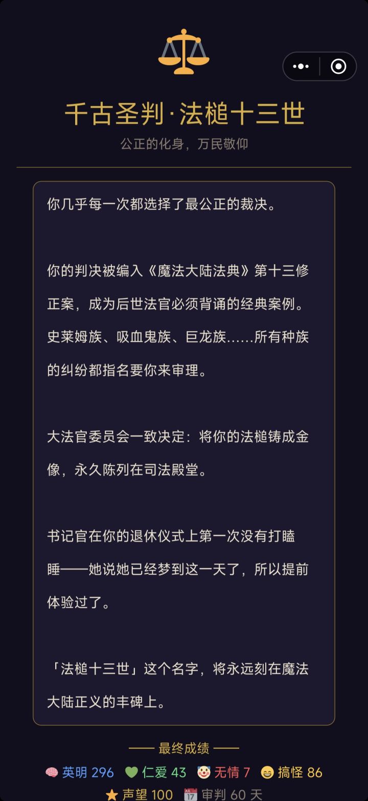 慢慢的判案下去,我真的代入了那个有趣的法官,真的让这个大陆越来越美好,就算中间有的判的有些遗憾,但是感觉超级有价值感!!!!
