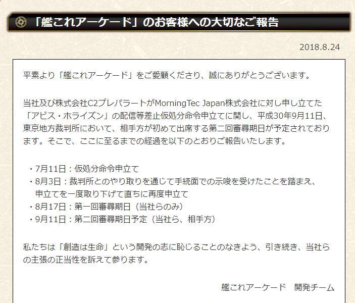 所有不明真相的群众都被世嘉给忽悠了自从世嘉联合C2发表公告,以《深渊地平线》涉嫌抄袭为由,告上了东京地方法院之后,很长时间都没了动静。时至今日,《深渊地平线》日服官方网发表了新公告,大意是“我方的律师团队已准备应对世嘉的诉讼,但从世嘉发布公告起,已过去3周时间,仍未收到任何法院的传票或是世嘉的证据”。原文如下:这里科普下这种诉讼的常识:提起这种诉讼后,1周左右法院就会将起诉方提供的证据交给被