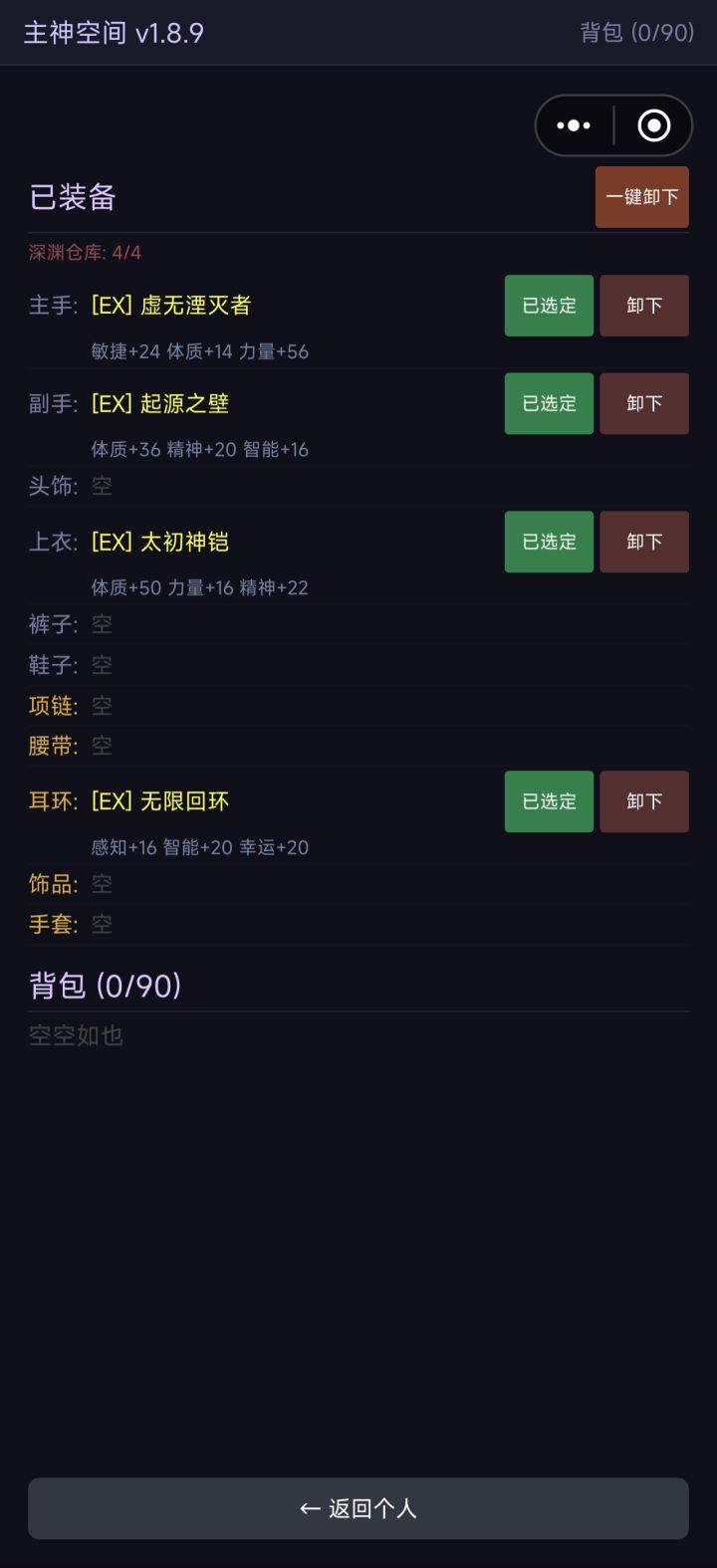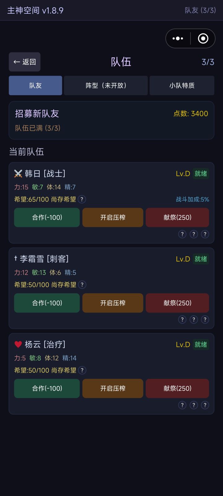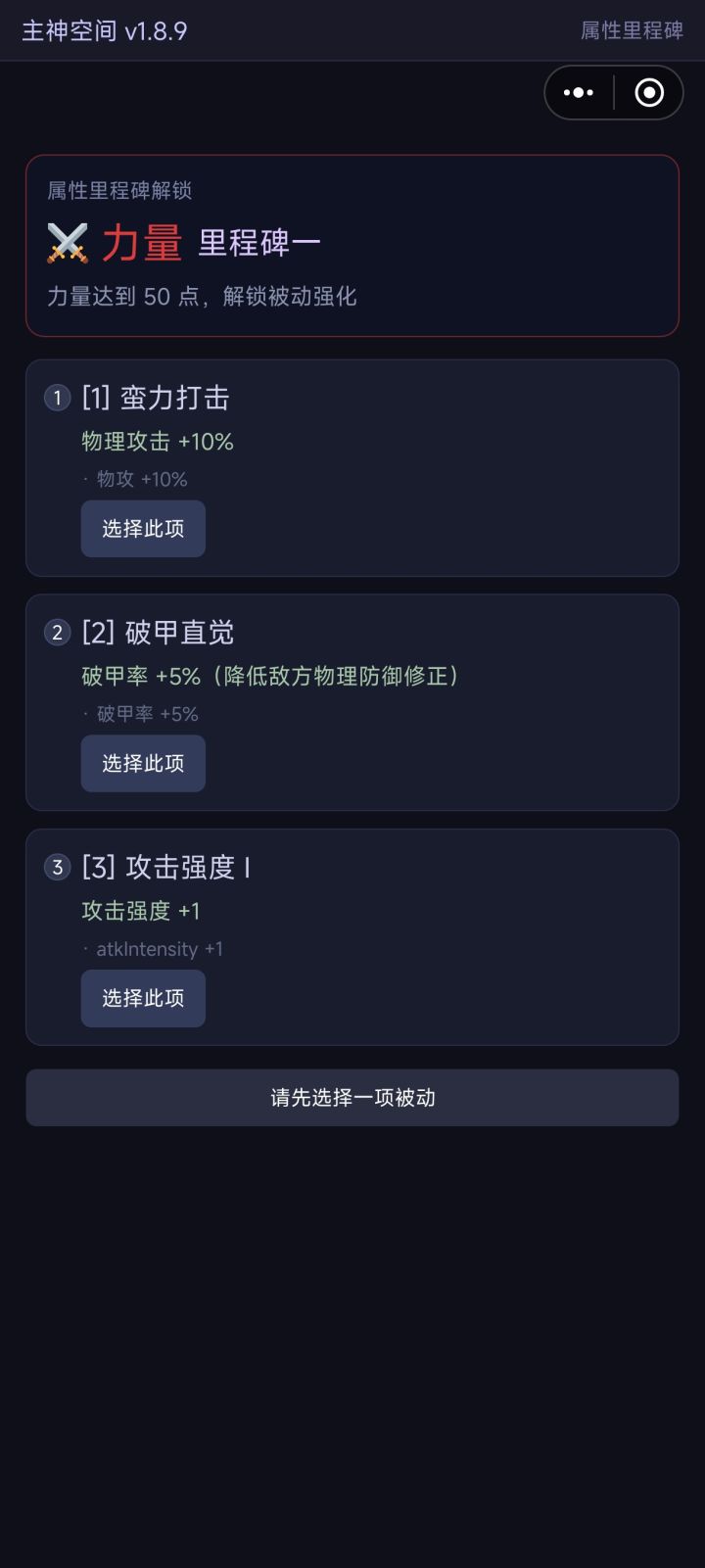 v1.8.3更了一坨大的1.队友界面改为队伍,新增了一些队伍特质2.新增深渊点,用于强化队伍特质,深渊点每过10层深渊获得一个3主神商店血统传承功法详情界面优化4属性仓新增+10功能5新增蓝条功能,以前有点bug一直没修(虽然现在也不少)6背包选定装备后,新周目开始时会自动穿戴,不用再点一遍了7天赋中sss深渊+10%词条时装8每50裸装属性(白色属性值)可获得一次三选一的被动技