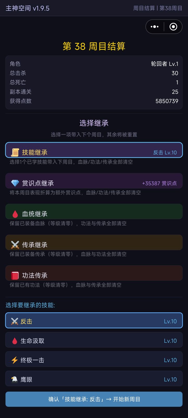 刚玩这游戏的时候第一次周目结算纠结半天也不知道选哪个,论坛也没搜到,所以自己写一个。以下是我的看法不一定对,周目结算保留天赋,深渊躯体化加点,赏识点,成就,称号,深渊仓库里的这6个东西。开局一两个周目缺赏识点,急着开天赋,选折成赏识点也是可以的。后面只推荐选功法传承,因为学了的功法全都保留,虽然说只能装备一个,但是每个轮回买不同的玩,全都可以一直带下去,每个轮回可以体验不同的搭配,不像血统和