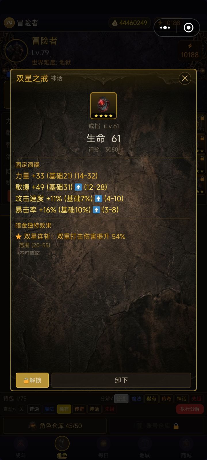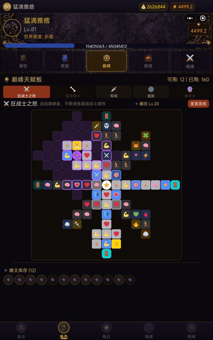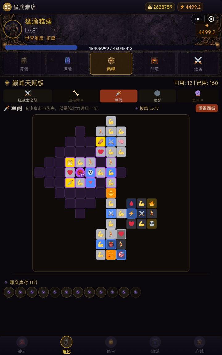 1.新版本同名铭文不能叠加(不要看旧攻略了) 但是可以和类似效果的神话“暗金独特”叠加2.技能加点如图。基础技能只带一个,多带,只使用伤害最高的。一般前期用狂乱。核心技能同理,建议使用双重打击。双重打击打BOSS快。撕裂是群攻,75级以后在限时副本刷小怪更快。3.神话装备因为精工(即强化)收益很低,作用不大。拿到核心神话(如图)双星之戒、第三之刃之后,可以在装备过滤直接分解。这两个神话装备可以
