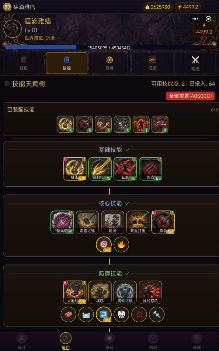 首先从技能上先说起! 技能篇核心技能—双重打击-狂暴(主要技能)后续手套位置带有一条+双重打击等级词条(附魔到3,精工可以+4)防御技能—大地践踏-裂地此技能为了晕住BOSS,让BOSS不会打你,适合所有流派必带技能。战吼-激昂增加攻击速度挑战狂吼-续命续命是真的续命噢,装备不带吸血带这个技能,可以回血,而且等P2虚空震荡的时候保证你是满血状态,不至于一下被打死。(伤害减免要求等
