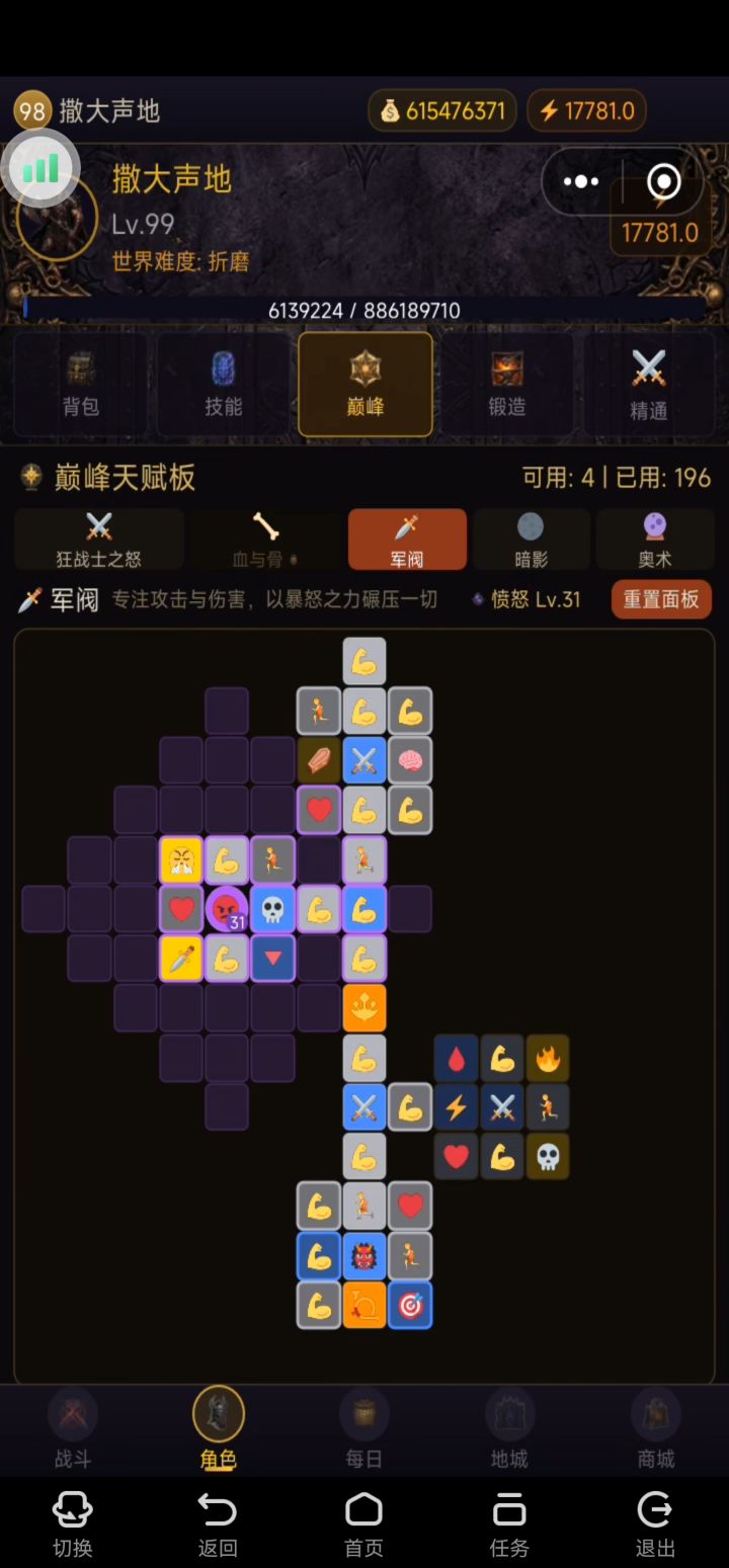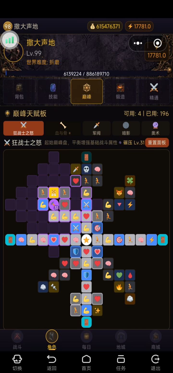 开具没啥好说的,速升等级,等级到80级是开始,主推用双重打击技能或者撕裂流血。1.技能搭配,基础技能:狂乱(狂暴)+1级-- 核心技能:撕裂(剧毒)+5级--核心被动:压力点+3--防御技能:大抵践踏(裂地)+5--战吼(激昂)+5--防御被动:(前期可以先点3级反攻后期有防御技能词条的裤子后改为被动全加1点,吃防御技能词条)--格斗技能:战争怒吼(鼓舞)+5--格斗被动:震耳回响+3--嘶声呐