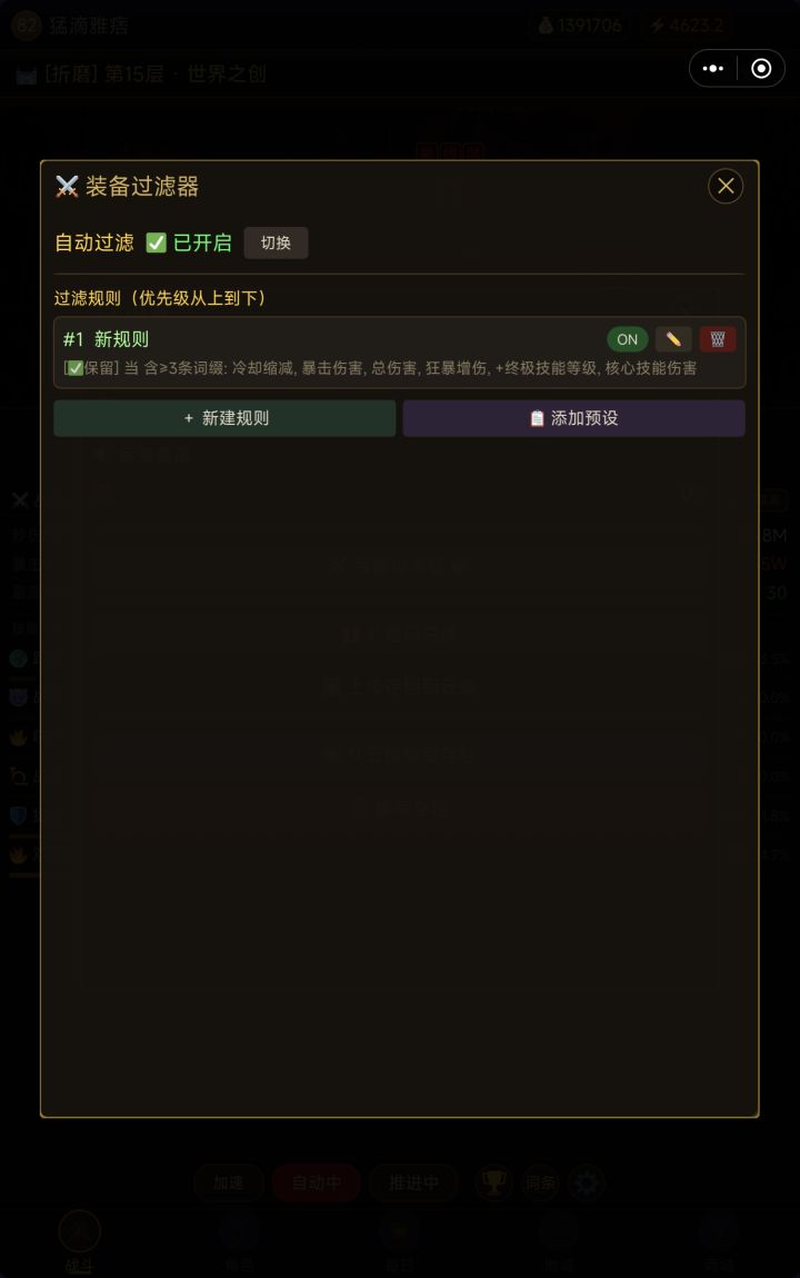 装备过滤器攻略在哪里打开?战斗界面 → 右下角 ⚙️ 设置 → 点击 ⚔️ 装备过滤器快速上手(推荐新手)打开过滤器 → 点击 「添加预设」 → 「⭐ 一键添加推荐组合」打开 「自动过滤」 开关完事了,挂机去吧分解所有白装、蓝装保留带暴击率/暴击伤害/攻速的稀有装分解没用的稀有装(无铭文+无好词缀)传奇、神话全部保留进阶玩法:自定义规则点击 「+ 新建规则」 可以自由组合条件: