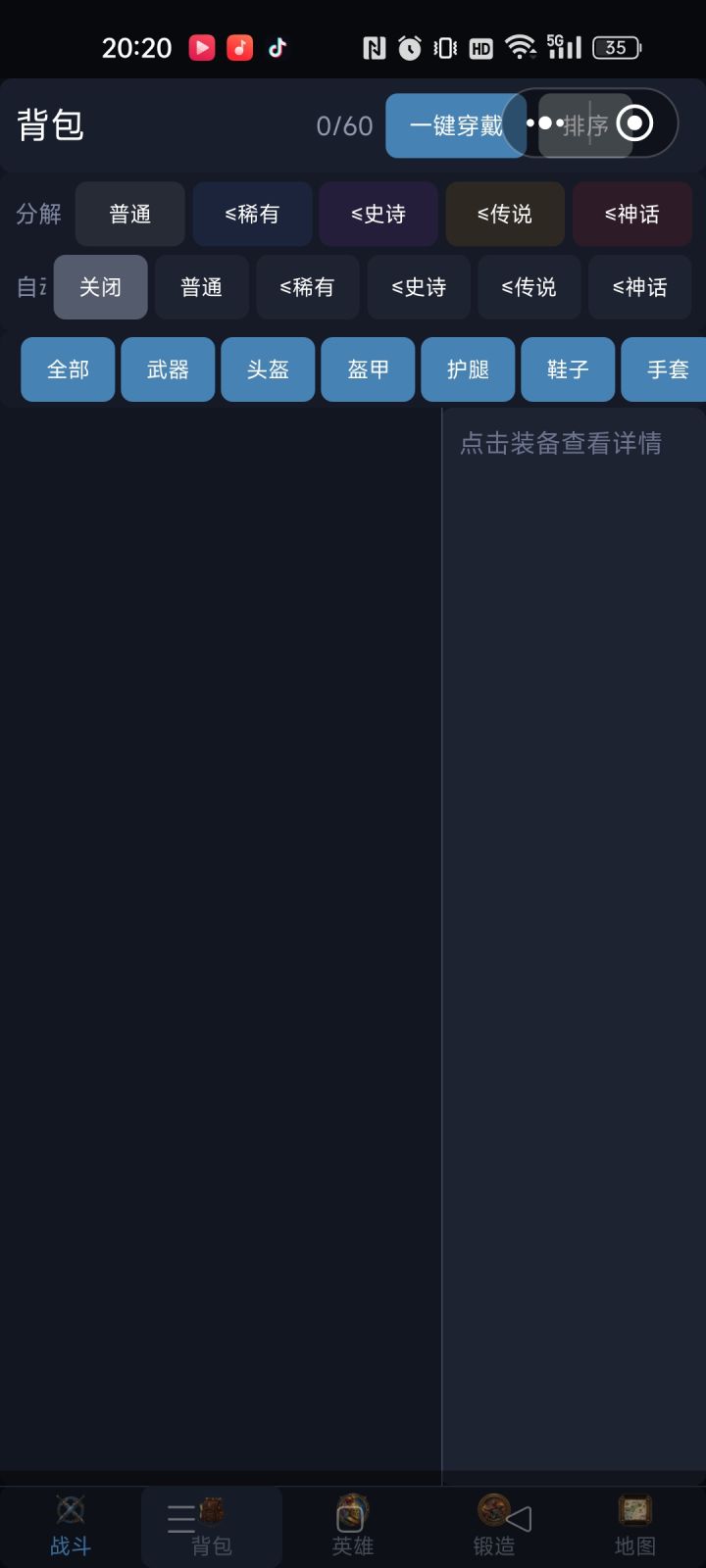 游戏不错,挂机养老党可以玩玩,背包一键换装UI要改一下,IOS设备被右上角退出园点挡住了,期待作者持续更新,期待上榜