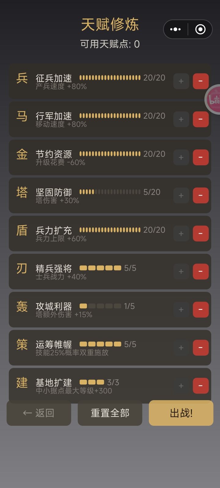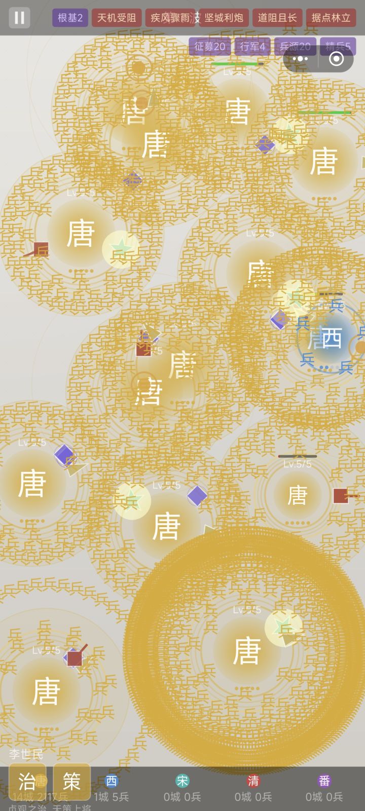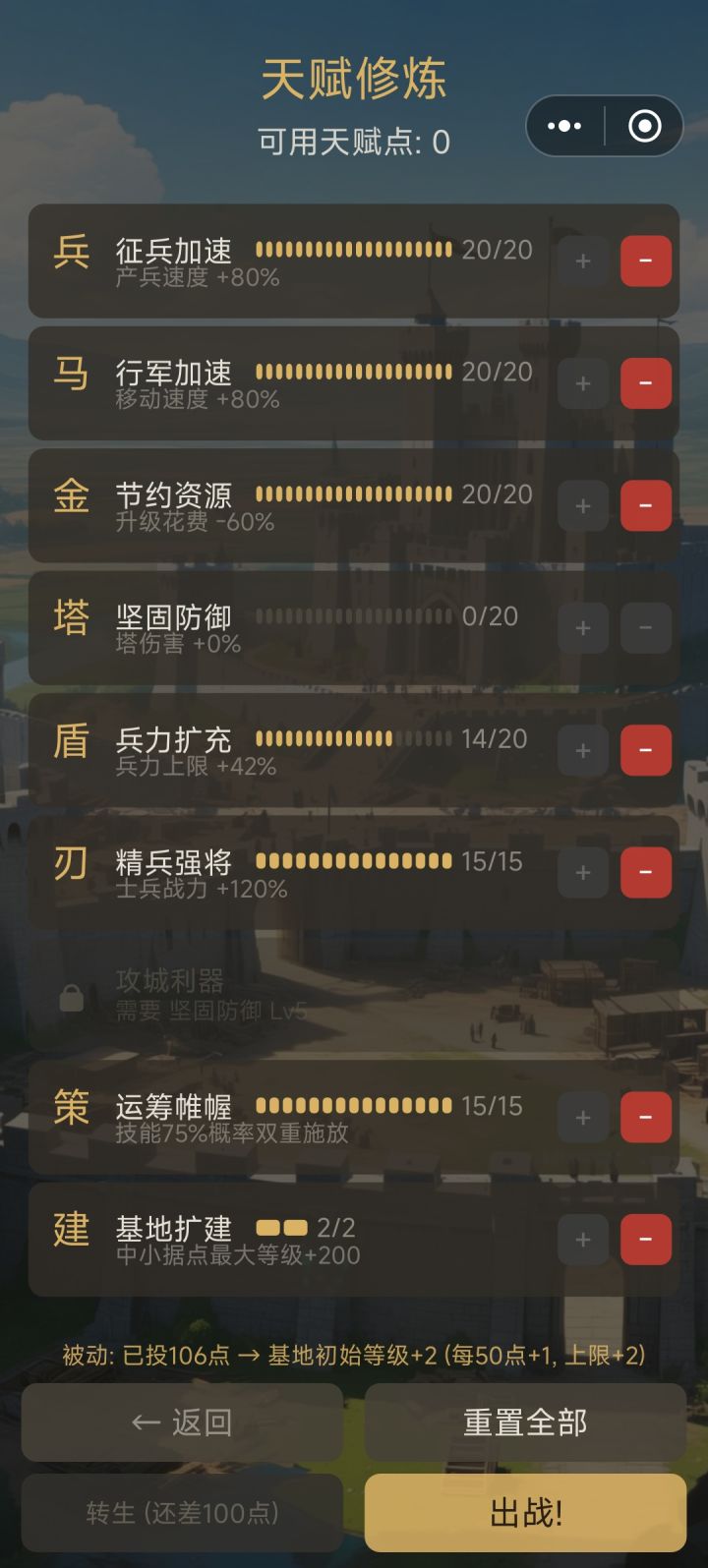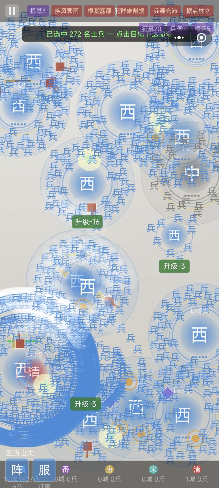 英雄技能重做成吉思汗「铁骑连射」改为向3个敌方目标持续派兵2秒,「天罚」改为全场敌方据点兵力-10%李世民「天策上将」改为全据点持续派兵攻击目标1秒技能冷却时间大幅调整,技能1冷却40秒,技能2冷却50秒,每次释放更需深思熟虑技能施法特效指向性技能新增光束特效(外发光+内芯+飞行粒子+命中闪光)非指向性技能新增冲击波特效(扩散环+据点闪光)AI 联盟博弈AI 之间会根据战场局势组建