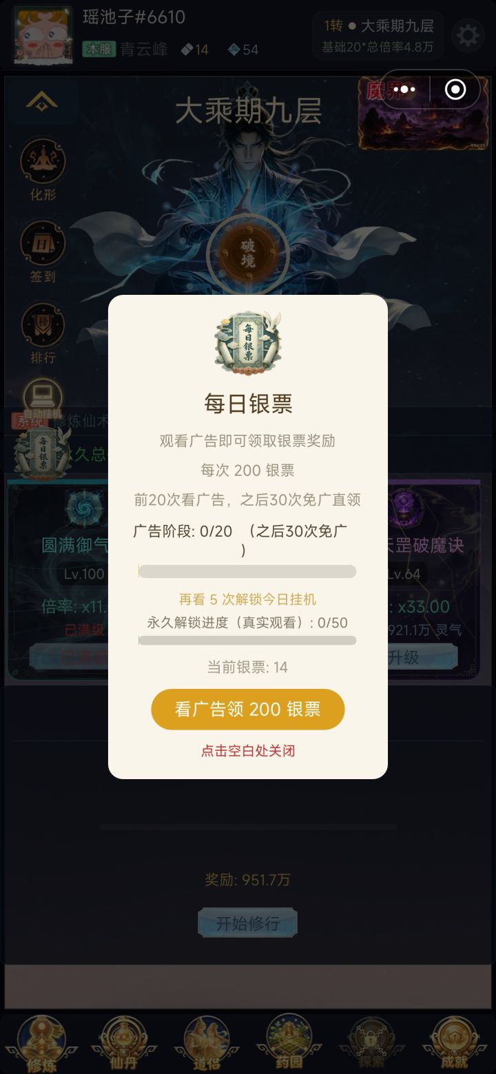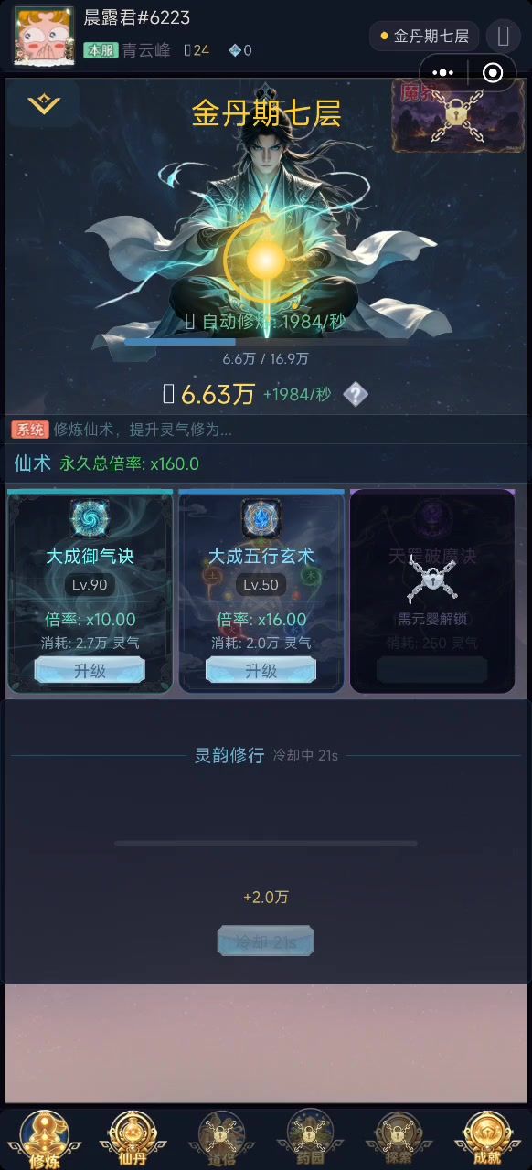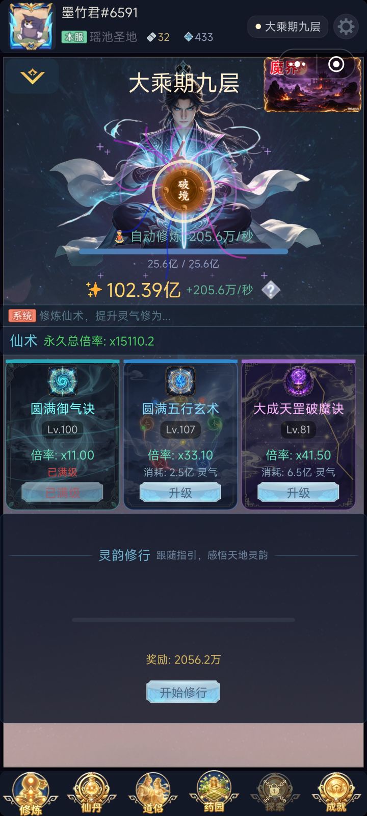 2026/04/12更新,版本号v1.1.1.15<1>优化药园自动没有立马刷新问题。<2>普通副本,精英副本改为无限体力,精英副本增加“下一关”功能。<3>新增梦魇副本。<4>优化整体数值显示。<5>新增法宝洗练功能。<6>道侣左侧按钮异常优化。<7>去除打坐成就。<8>原人界转生影响属性改为所有世界转生均增加属性。<9>丹药效果不在影响药园种子价格。
