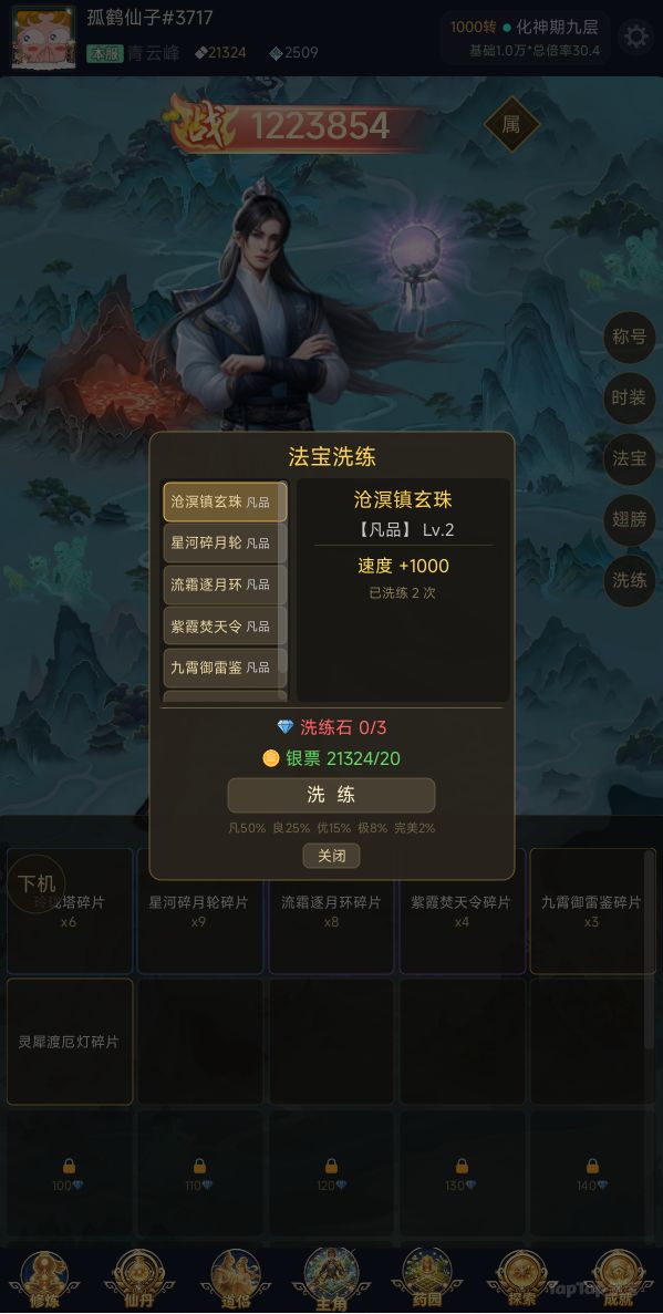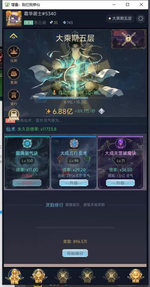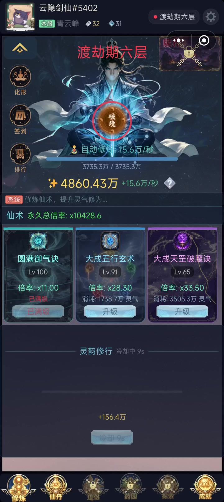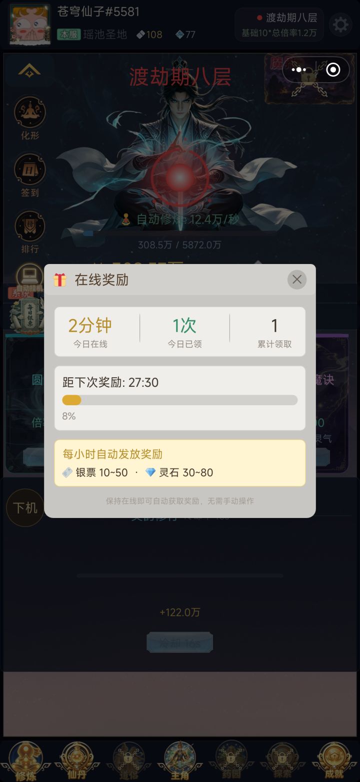 2026/04/12更新,版本号v1.1.1.15<1>优化药园自动没有立马刷新问题。<2>普通副本,精英副本改为无限体力,精英副本增加“下一关”功能。<3>新增梦魇副本。<4>优化整体数值显示。<5>新增法宝洗练功能。<6>道侣左侧按钮异常优化。<7>去除打坐成就。<8>原人界转生影响属性改为所有世界转生均增加属性。<9>丹药效果不在影响药园种子价格。