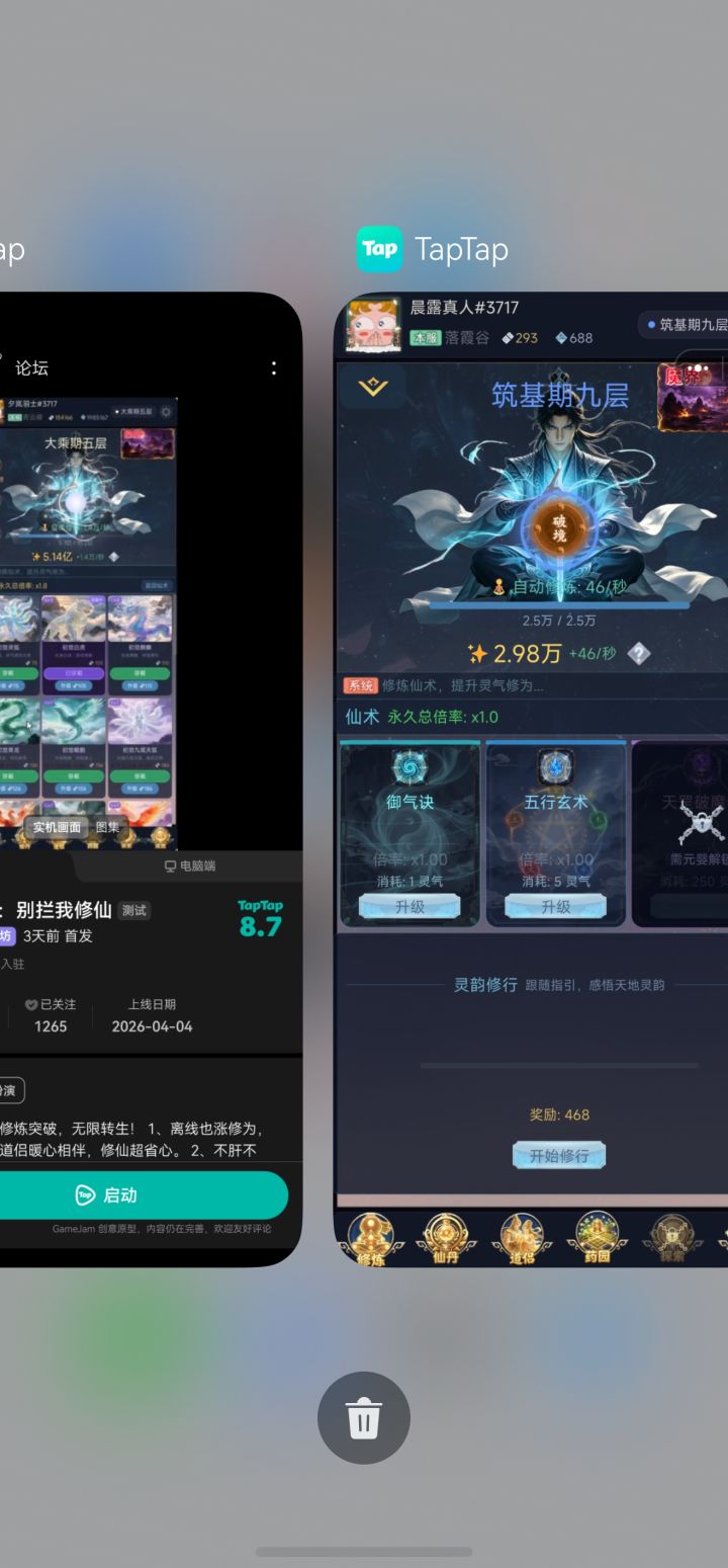 道友们,这几天接到反馈离线奖励异常问题,这边进行了一些汇总,如下:一:不同机型关闭游戏的方式略有不同,有些手机会出现tap平台应用与游戏存在双进程情况,需要平台+游戏全部关闭后才进入离线状态。二:单进程,需要点击右上角“。。。”符号,重启游戏在退出就会进入离线状态。若此方案还未能解决道友的问题,进群咨询作者继续解决优化不同机型的问题。谢谢道友一路支持,我们将会竭尽全力的修复好bug,适应每