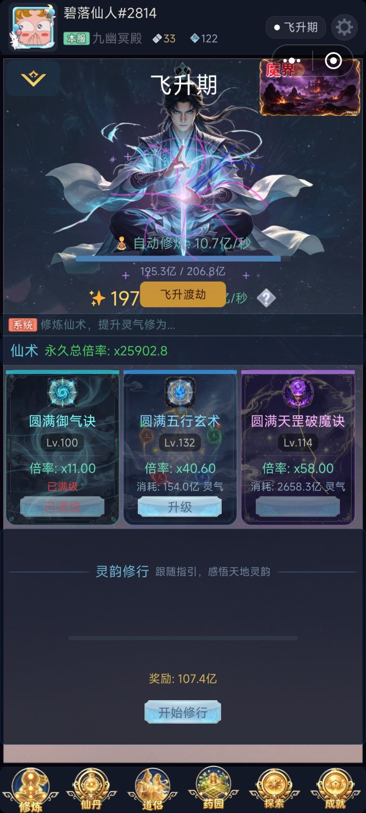 2026/04/12更新,版本号v1.1.1.15<1>优化药园自动没有立马刷新问题。<2>普通副本,精英副本改为无限体力,精英副本增加“下一关”功能。<3>新增梦魇副本。<4>优化整体数值显示。<5>新增法宝洗练功能。<6>道侣左侧按钮异常优化。<7>去除打坐成就。<8>原人界转生影响属性改为所有世界转生均增加属性。<9>丹药效果不在影响药园种子价格。
