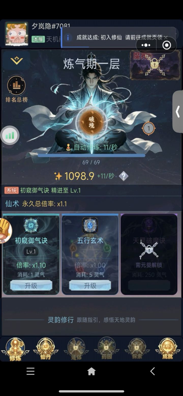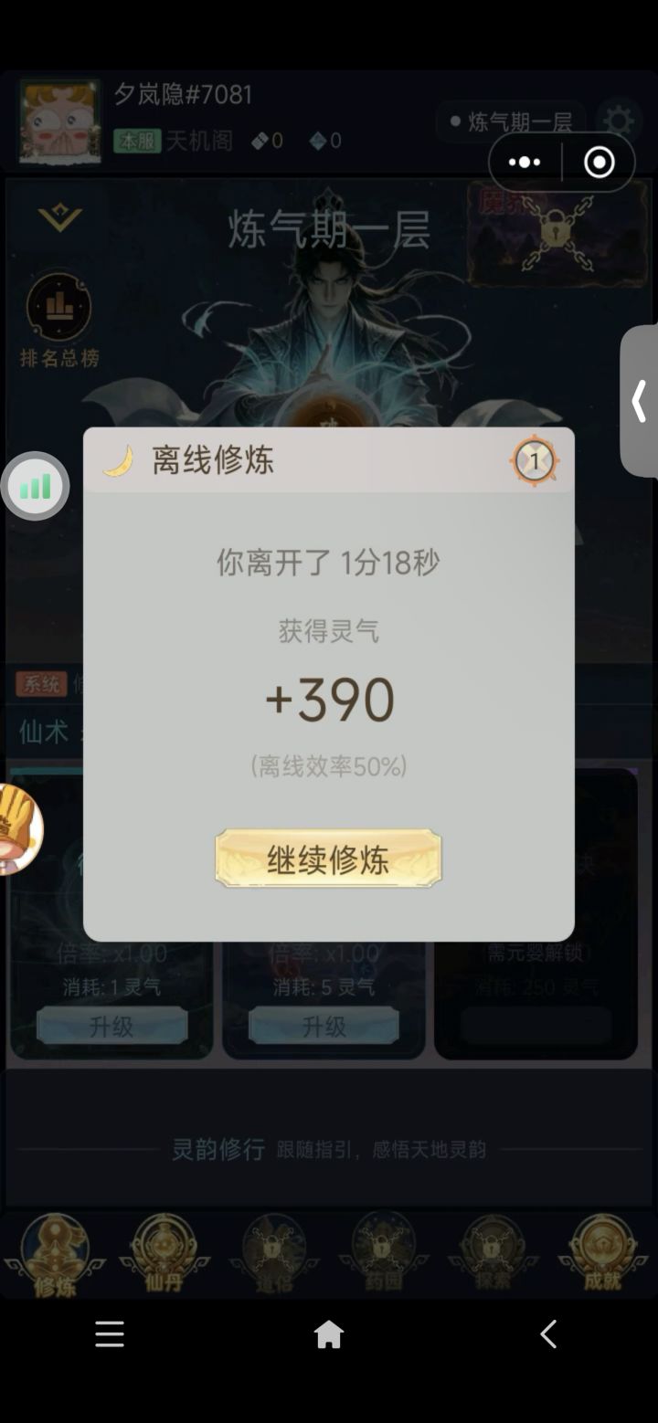 2026/04/12更新,版本号v1.1.1.15<1>优化药园自动没有立马刷新问题。<2>普通副本,精英副本改为无限体力,精英副本增加“下一关”功能。<3>新增梦魇副本。<4>优化整体数值显示。<5>新增法宝洗练功能。<6>道侣左侧按钮异常优化。<7>去除打坐成就。<8>原人界转生影响属性改为所有世界转生均增加属性。<9>丹药效果不在影响药园种子价格。