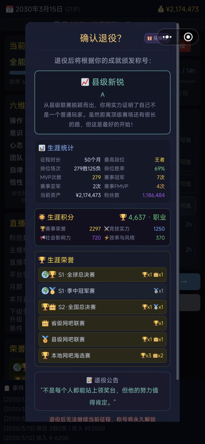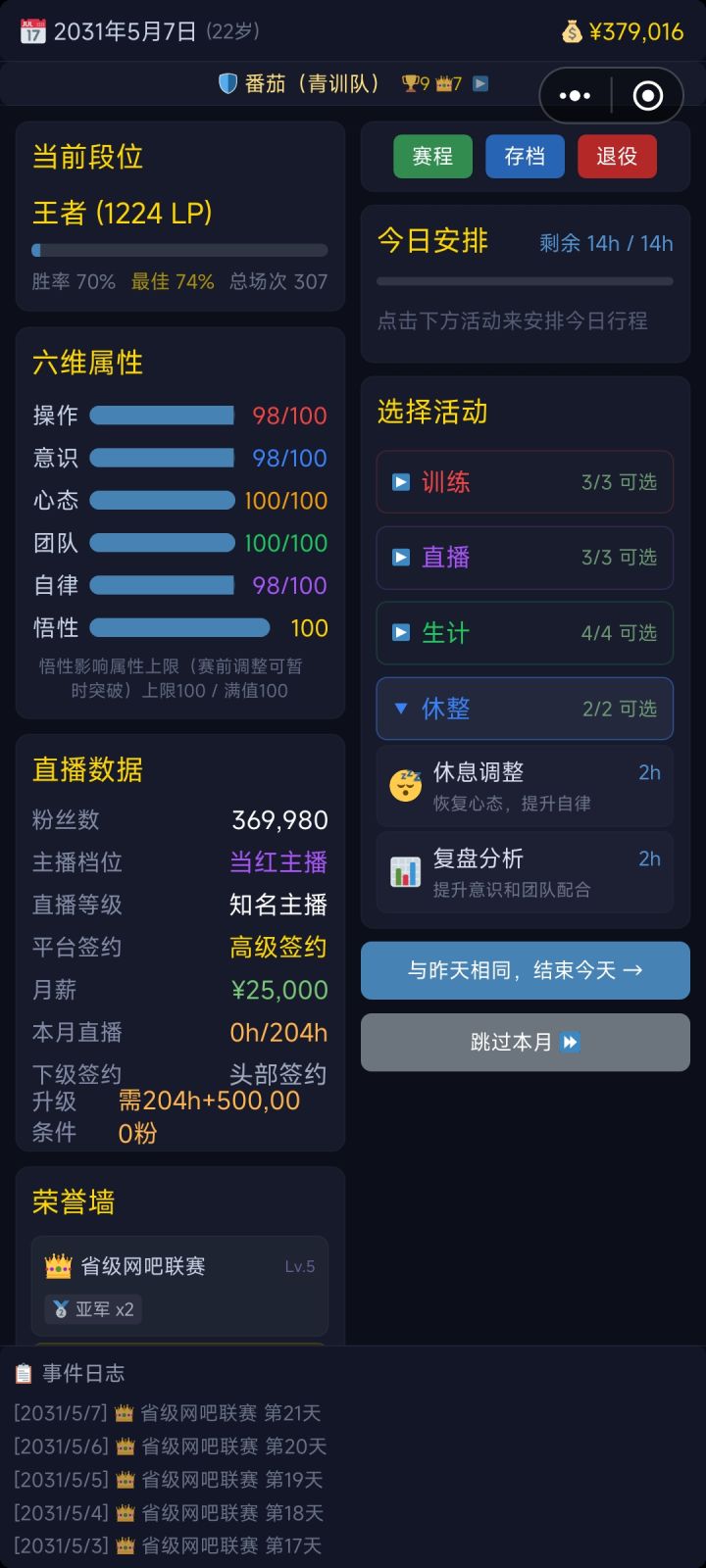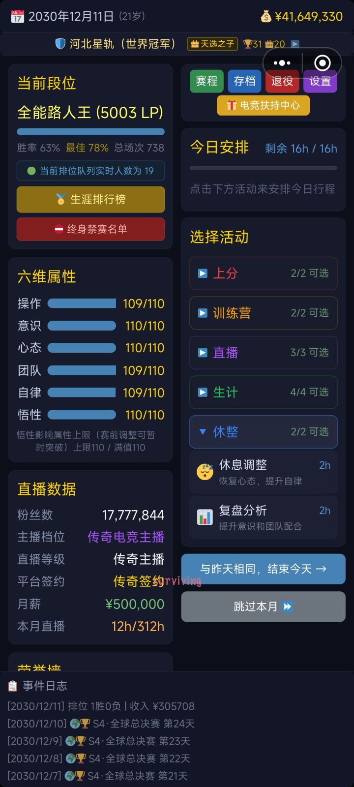 目前的内容量:109个随机/选择事件、20+个结局、7级赛事体系、完整的直播签约系统、里程碑称号收集,还有5个金色稀有事件等你触发。可玩性很高,但要全结局收集……我自己测试都还没集齐。