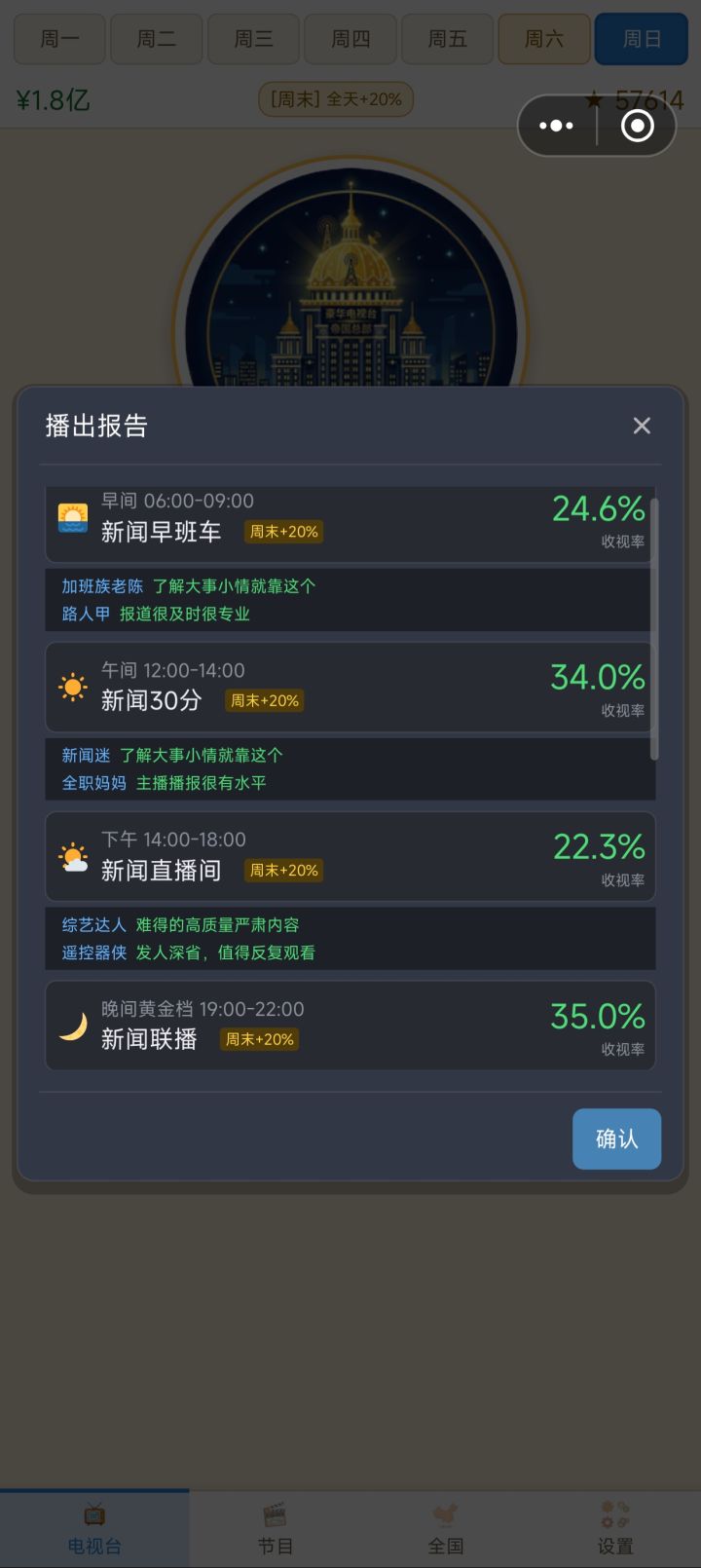 转职新闻频道,直接无脑攒钱,刷出来一个a级的员工直接投资拉满做新闻,五个s级新闻节目一天收视率拉爆,直接通关成就刷满全部收购。做电影得每天一排节目表,做电视剧综艺还需要换,新闻频道直接无脑点模拟