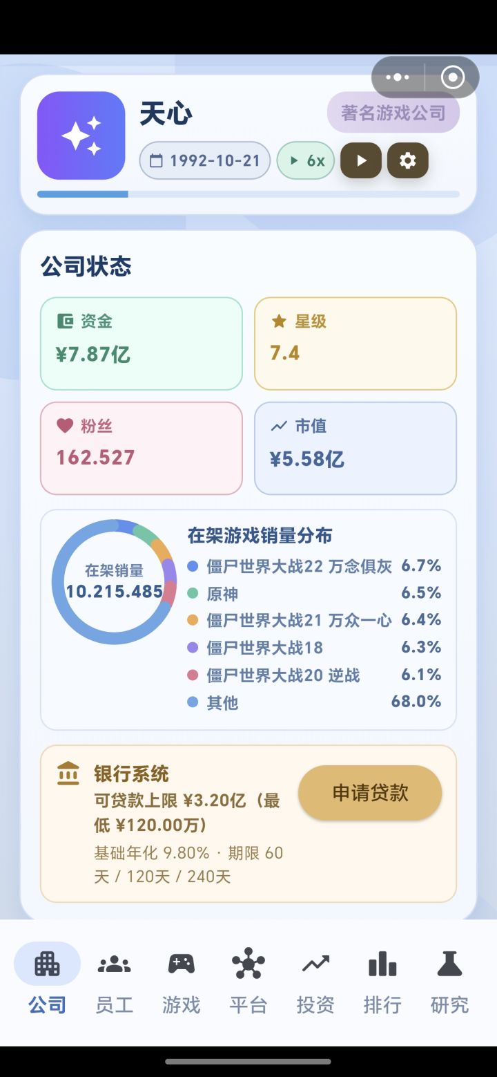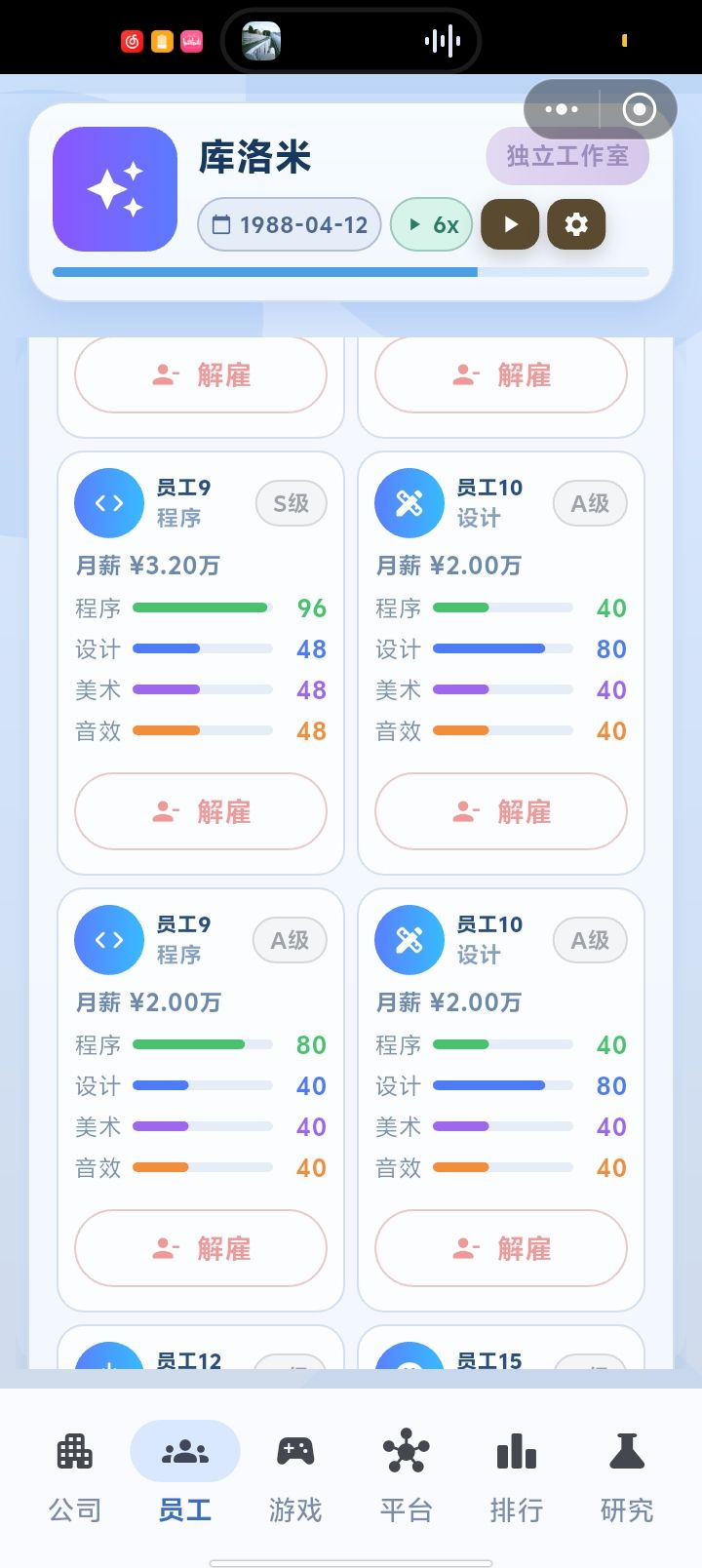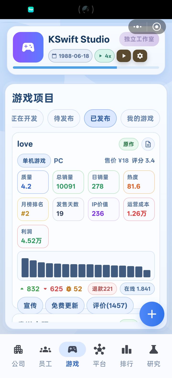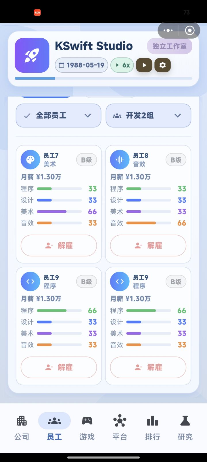 困难难度开局,建议科技身份开,初始的资金14万不要乱花,六倍速研究最便宜的科技,先单机游戏开发第一个,价格可以定到17,更高不建议。按照这个第一个游戏发了之后就以此把剩下的三个技术一起学了。全部学完后游戏开发的进度应该到了第二款或者第三款游戏。资金到了二三十万左右就可以开始招聘员工了,最低级的员工招聘三个就可以了,按照固定顺序会是,美术-音效-技术。这个时候开启第二个组,把初始给的另外一个