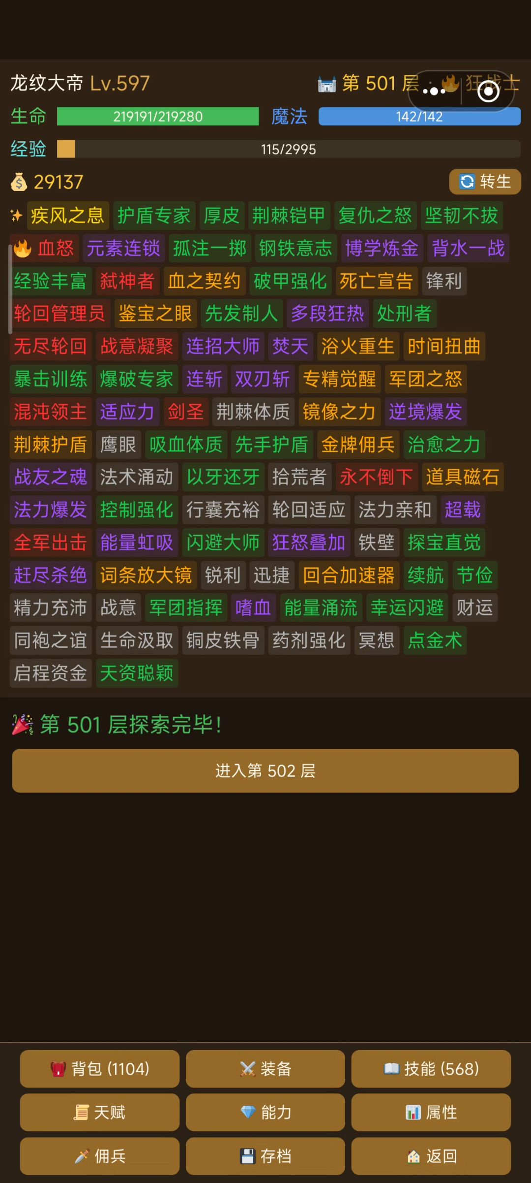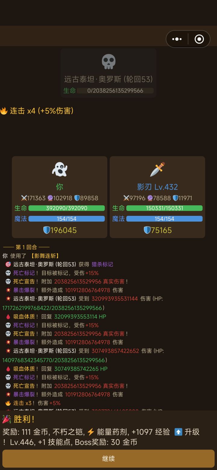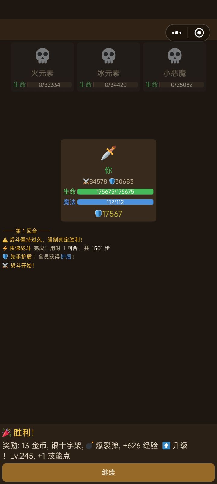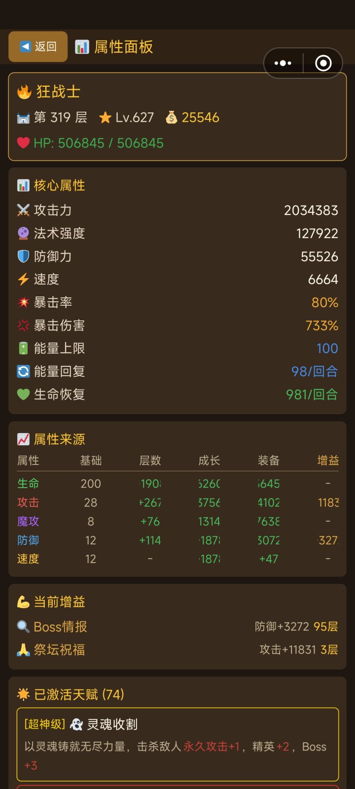 有打到200多层的老哥交流下嘛。你们属性咋样,是200多层的怪就是这样的还是变量被我打穿了。我这个应该是代码写错了。1。03倍一直叠加了,天赋叠加起combo了。就玩了几十层。然后就开始一直跳关了。有点上头。本来还想打到502睡觉的