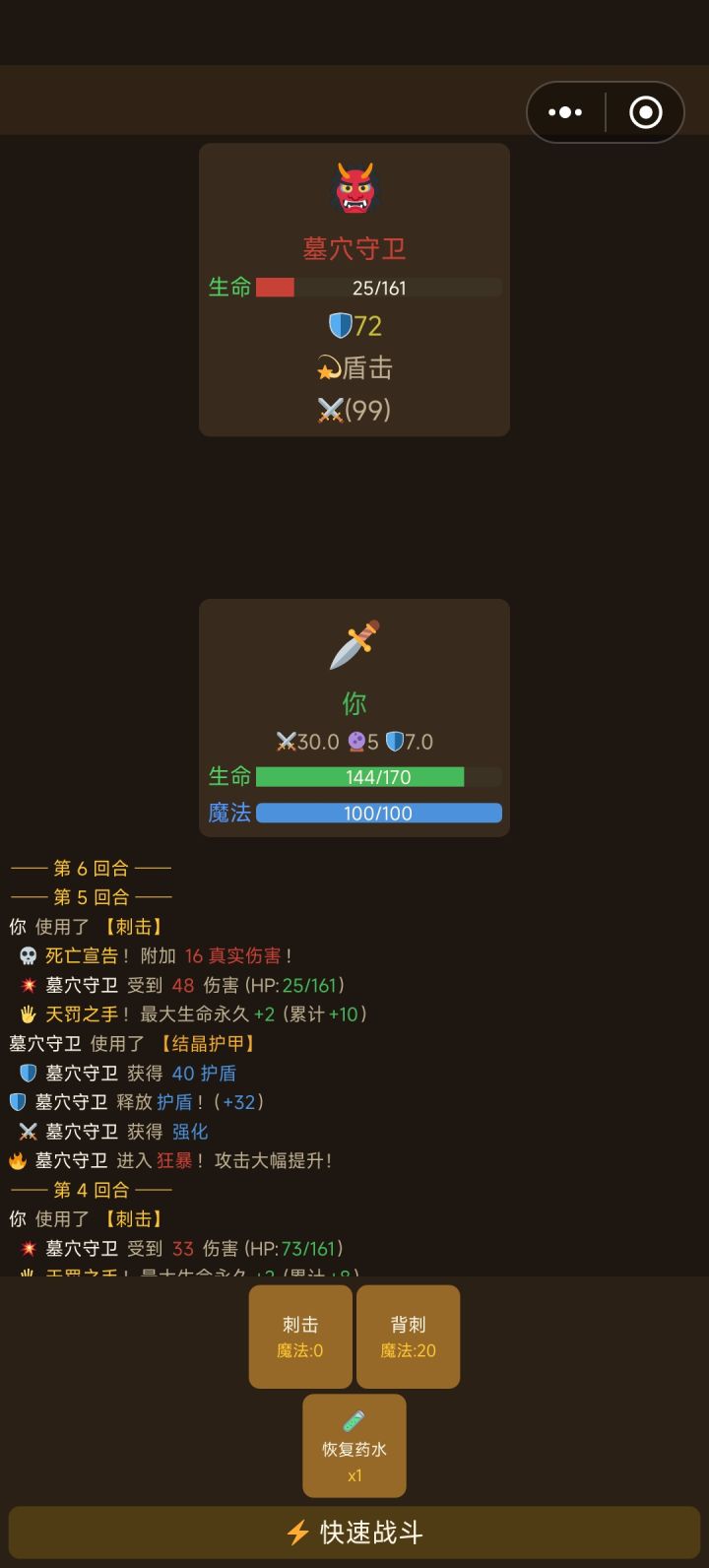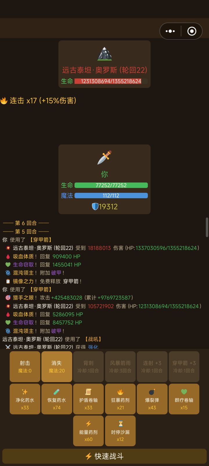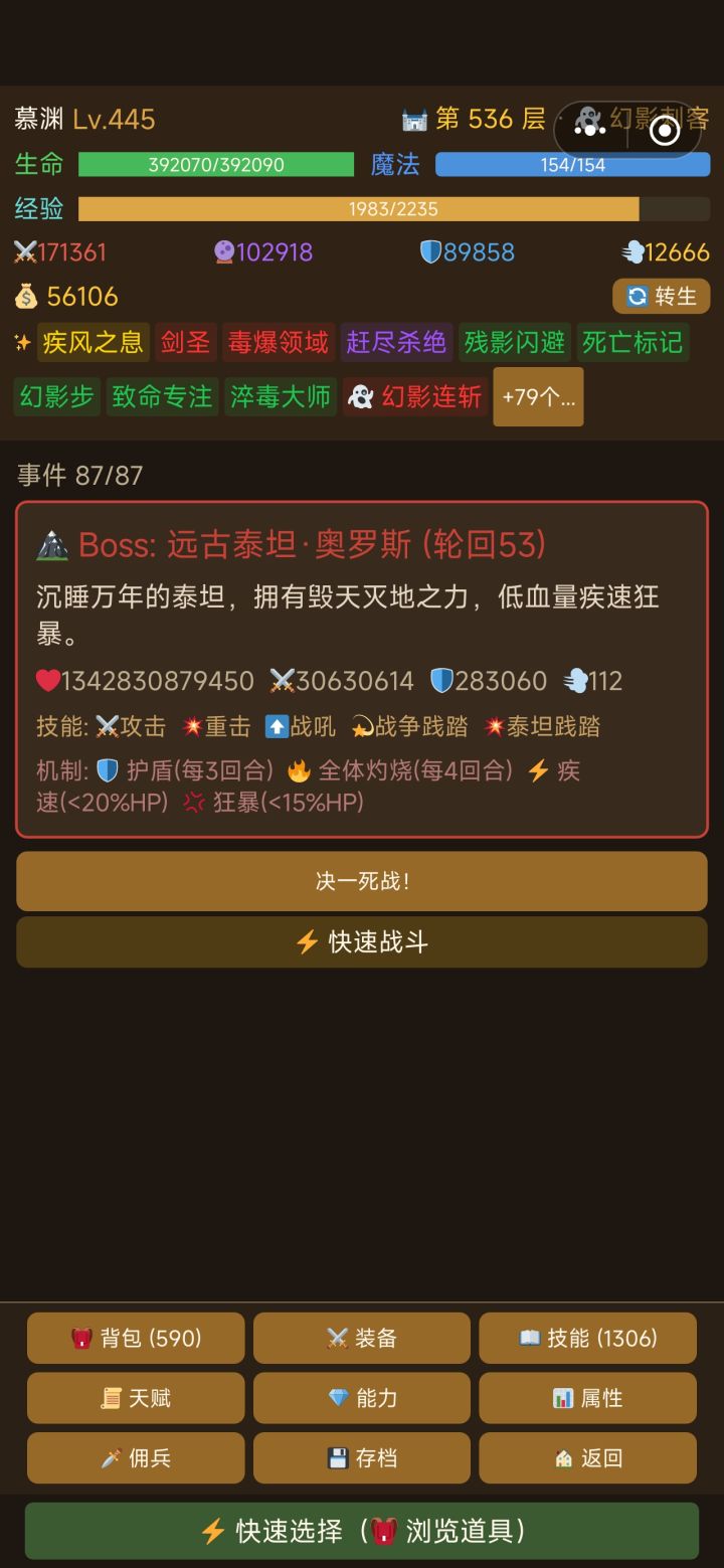 找到个影响平衡点我感觉,纯道具流逃课,抽到那个几个掉落道具的天赋,基本职业打到80层左右就解放了,只用狂暴药一喝,砍一刀,时停药一喝,再砍一刀就带走了,后面怪血厚起来丢炸弹就完事了,这些道具行为都不计入回合数,相当于怪动不了,等着被炸,后期有那几个天赋炸弹就几百个,见boss丢就行了,一轮60多小怪炸弹随便掉,打boss只用3个