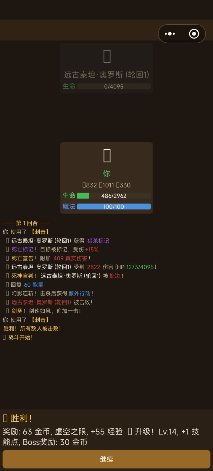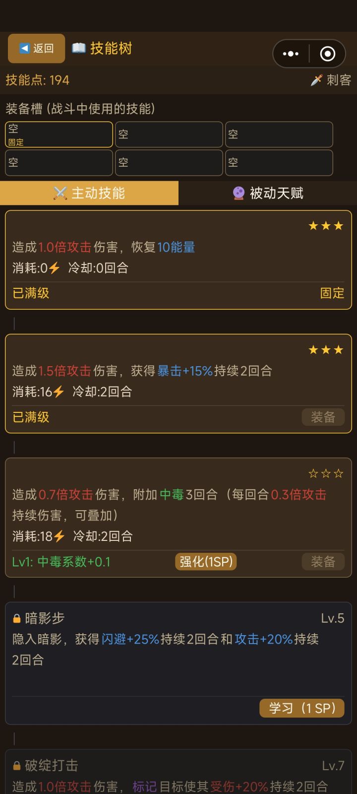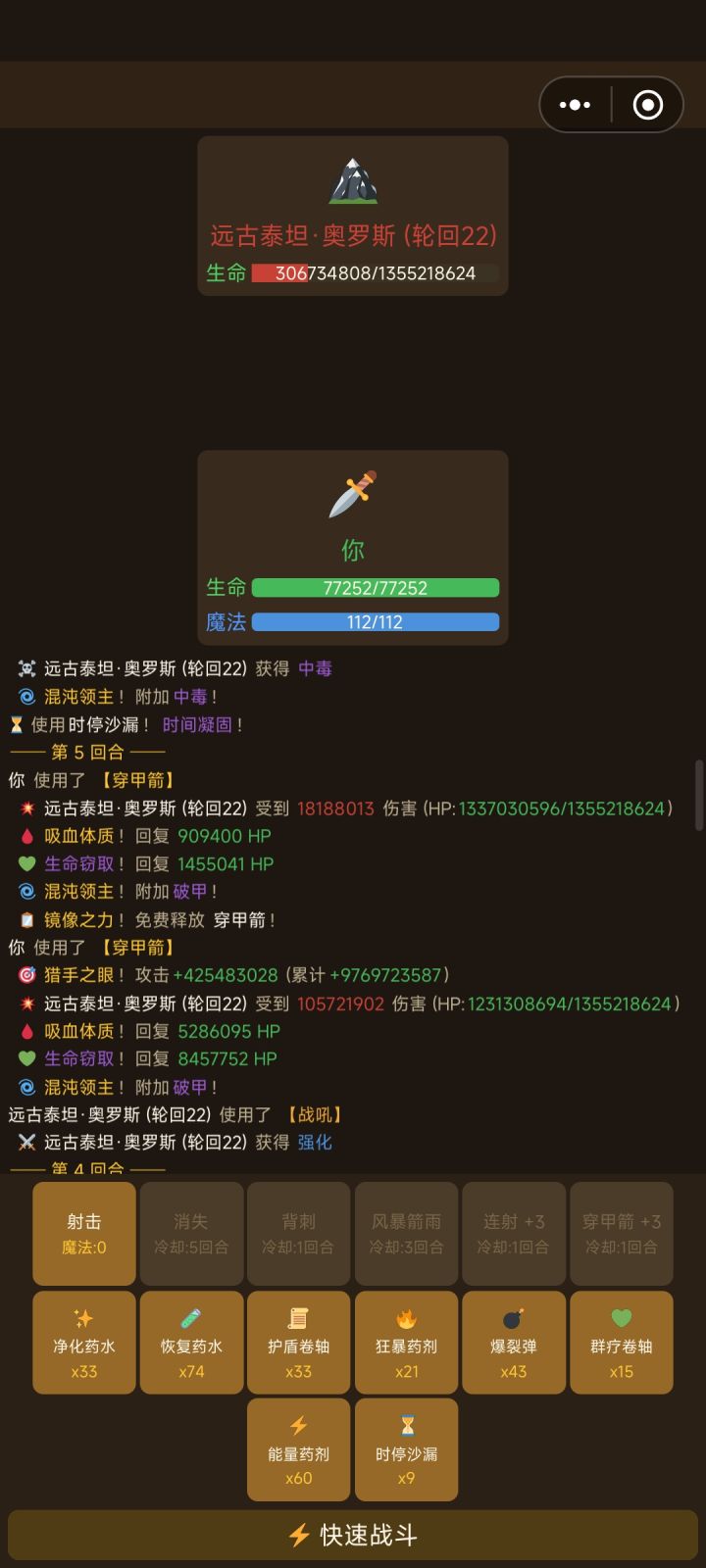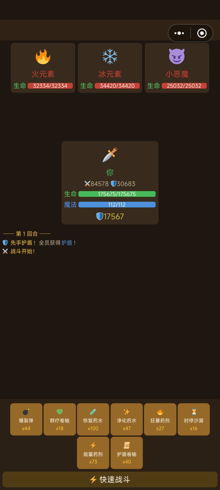 技能槽里加不上技能,战斗的时候没得攻击,但是有个快速战斗,于是打谁都不掉血,稳赢。。。
