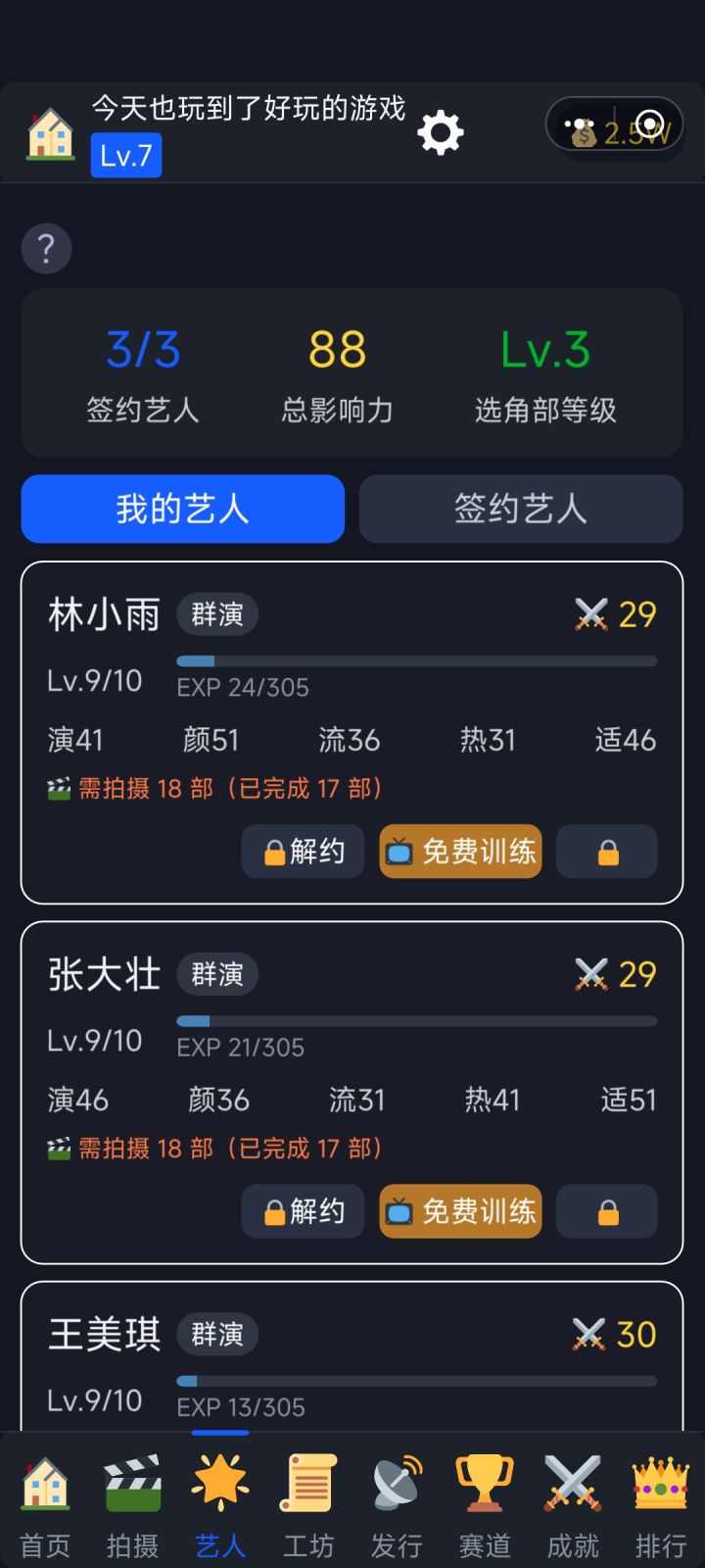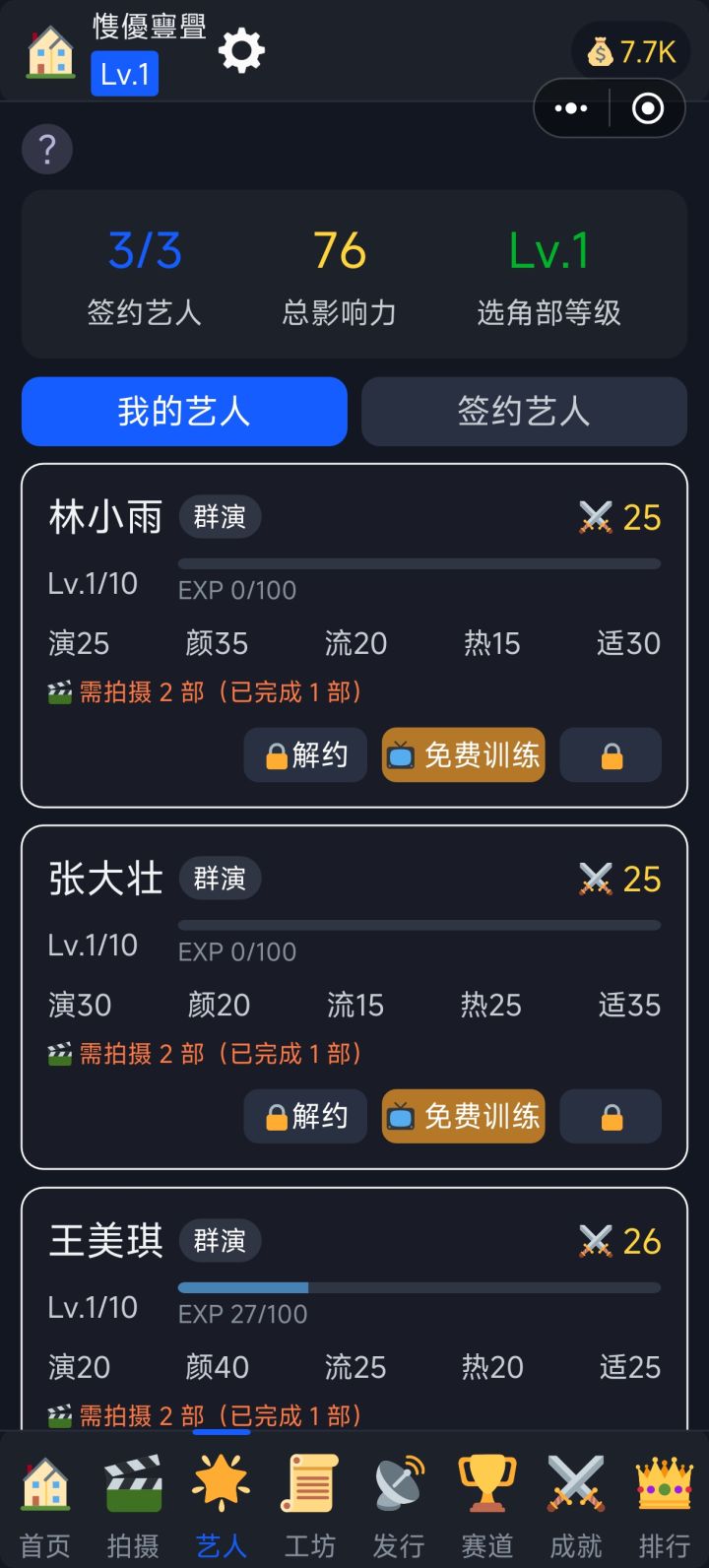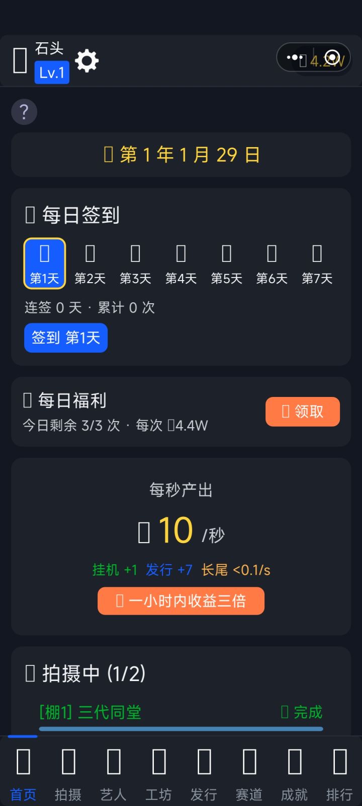 《短剧大亨模拟器》新手攻略从零开始,手把手教你成为短剧界顶流大亨!一、游戏简介《短剧大亨模拟器》是一款短剧题材的挂机经营游戏。你将从一间草根工作室起步,亲手操刀剧本创作、选角拍摄、流量宣发全流程,最终打造短剧帝国、登上行业之巅。二、核心玩法——拍摄与发行拍摄是赚钱的根基。 进入拍摄页,点击「新建拍摄」,选一个剧本和一位艺人,支付制作费即可开拍。拍摄完成后系统会判定是否爆款——命中爆款收益翻倍,最高可达20倍!拍好的剧别浪费,去「发行」页把成品剧发布到平台,每日自动产生持续收入。发行是长线收益的重要来源,记得及时收取。**拍低成本的题材攒经验,拍完立刻发行,让钱滚起来。三、公司升级——解锁更多玩法首页就是你的公司总部。升级公司等级需要金币和一定的历史拍摄次数。公司升级后可以解锁六大部门:编剧部:解锁更多题材和更高品质剧本拍摄部:缩短拍摄时间、增加拍摄位(最多可同时拍7部!)推广部:提高爆款概率和发行收益艺人部:解锁更多签约位,提升培训效果公关部/风控部:高级玩法,提供流量声望加成,解锁争议题材新手建议: 优先升编剧部和拍摄部,一个提高剧本质量,一个加快出片速度。四、艺人——你的摇钱树艺人分七个等级,从群演到传奇。等级越高,收益倍率越高、拍摄越快。记得定期培训艺人提升等级,攒够钱后签约更高级的艺人。注意:艺人拍完一部剧后需要休息,休息期间不能再上阵。合理安排艺人轮换是高效出片的关键。五、进阶系统随着公司等级提升,以下系统会逐步解锁:工坊(创作原创剧本): 消耗灵感,通过「选题→大纲→打磨」三步创作高品质剧本。原创剧本拍摄能获得额外加成,冲击传奇大爆的利器。灵感每日自动恢复,别让它溢出浪费了。赛道(Lv.20解锁): 六条赛道代表公司多元化发展——微综艺、非遗文化、MCN孵化、网络大电影、全球出海、院线电影。投入资金启动项目,倒计时结束即可收取丰厚回报。还有「赛道豪赌」玩法,50%概率赢取翻倍奖金!副本: 分常规副本、挑战副本和剧情副本。常规副本根据你的部门综合实力评分发放奖励;挑战副本是高风险高回报的赌局;剧情副本通关奖励丰厚,值得优先挑战。六、省心挂机与日常收益挂机收入:即使不操作也在持续赚钱,离线最多累积8小时每日签到:连续7天一个周期,天天签奖励更丰富每日福利:每天3次免费领取金币,别忘了点看广告:离线收益可翻3倍、拍摄可秒完成、还有一键完成所有赛道项目等强力加速,善用广告事半功倍七、新手黄金路线跟着新手引导完成第一次拍摄和发行用初始资金多拍几部低成本剧,积累拍摄次数升级公司到Lv.10,解锁拍摄部和推广部持续升级编剧部和拍摄部,提高品质和效率签约更高级的艺人,收益大幅提升Lv.20后开启赛道,多线收入齐头并进挑战副本获取额外奖励,加速成长记住:多拍多发,钱生钱,量变引起质变!祝你早日登顶短剧帝国!