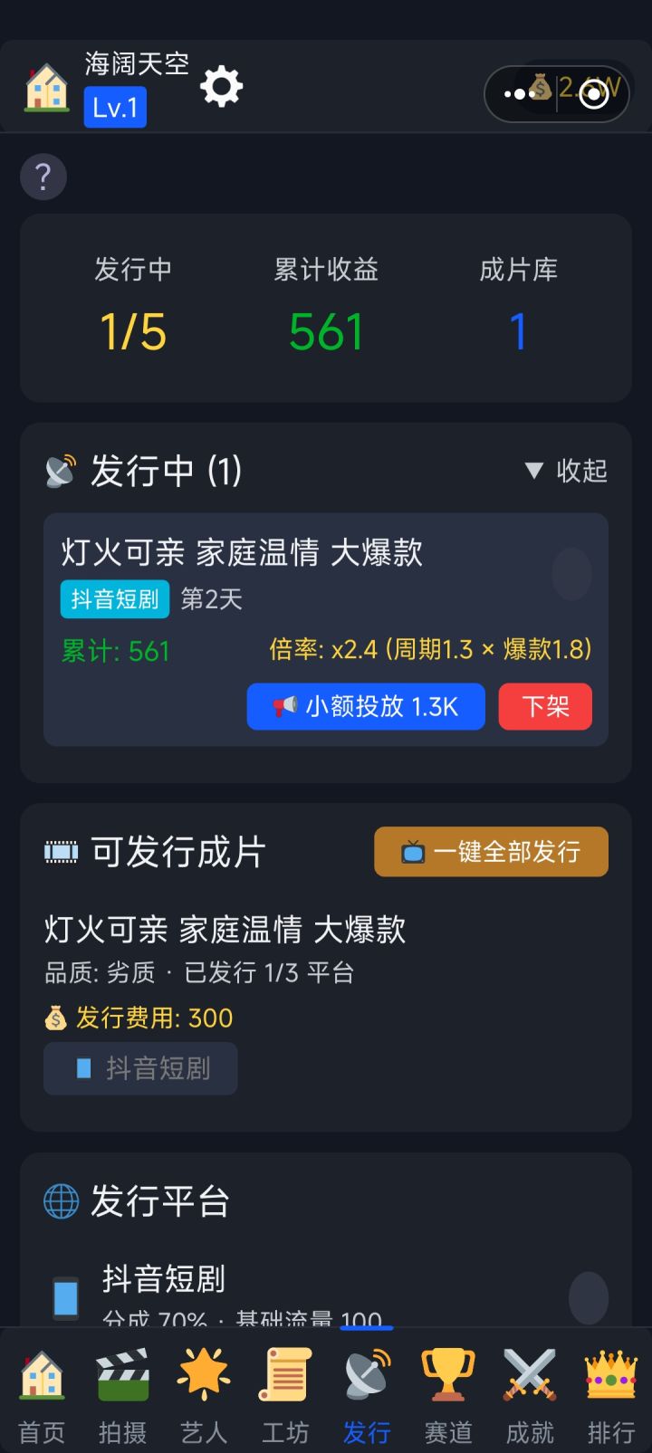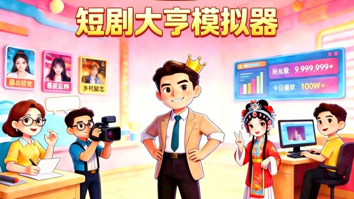 从零开始,手把手教你成为短剧界顶流大亨!一、游戏简介《短剧大亨模拟器》是一款短剧题材的挂机经营游戏。你将从一间草根工作室起步,亲手操刀剧本创作、选角拍摄、流量宣发全流程,最终打造短剧帝国、登上行业之巅。二、核心玩法——拍摄与发行拍摄是赚钱的根基。 进入拍摄页,点击「新建拍摄」,选一个剧本和一位艺人,支付制作费即可开拍。拍摄完成后系统会判定是否爆款——命中爆款收益翻倍,最高可达20倍!拍好