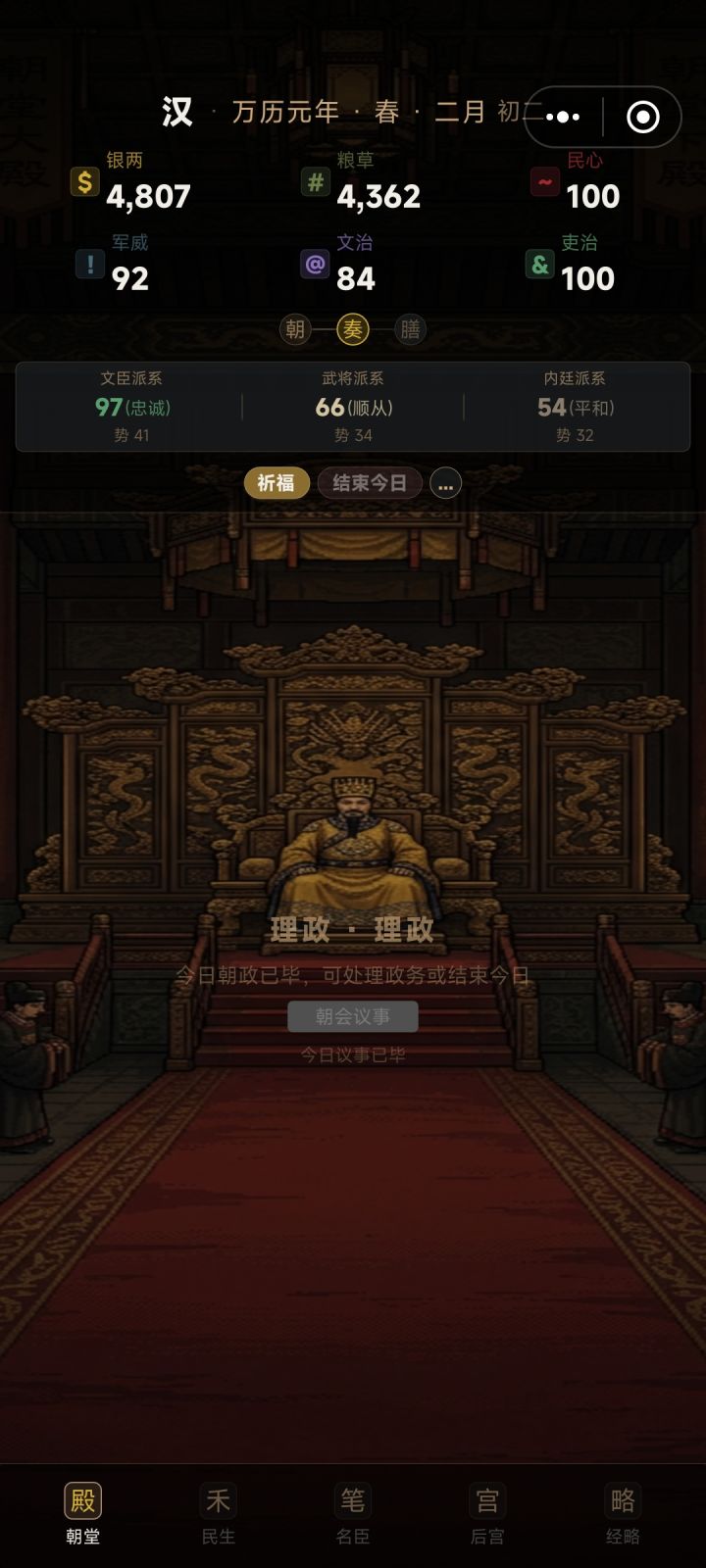 如果遇到更新前的问题:可以点击右上角按钮三个点刷新【新游上线】《天子模拟器:盛世长歌》— 龙椅之上,孤家寡人各位玩家好,《天子模拟器:盛世长歌》现已上线。这是一款竖屏帝王模拟经营游戏。你将扮演一位刚刚登基的少年天子,在朝堂纷争、派系倾轧、后宫暗涌中,走出属于自己的帝王之路。游戏简介每一个决定都牵一发而动全身。银两、粮草、民心、军威、文治、吏治——六维国力此消彼长,稍有不慎便是国破家亡。