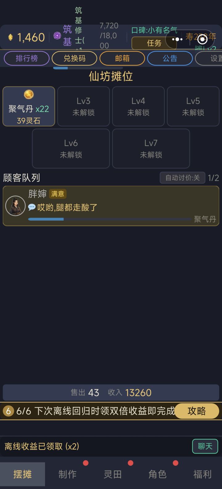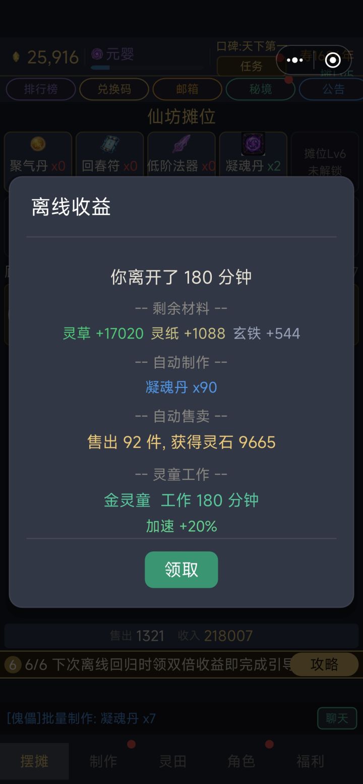 感谢各位道友一路支持本次大版本更新内容如下:【一、仙界系统】突破天仙后飞升仙界,解锁仙界专属商品、制作配方和灵田种子(灵晶草/天蚕丝/星辰矿),新增3条跨阶合成配方。飞升后自动解锁全部凡间摊位。【二、师徒系统】完整收徒/拜师/出师流程,师父可每日赠送法宝和珍藏给徒弟,支持离线邀请,聊天页顶部集成师徒入口。【三、聚宝阁】增加灵石购买材料,与渡劫丹药。【四、风水阵】布置风水阵位加速灵