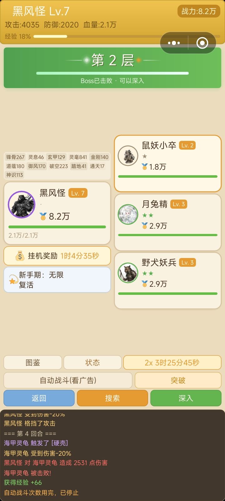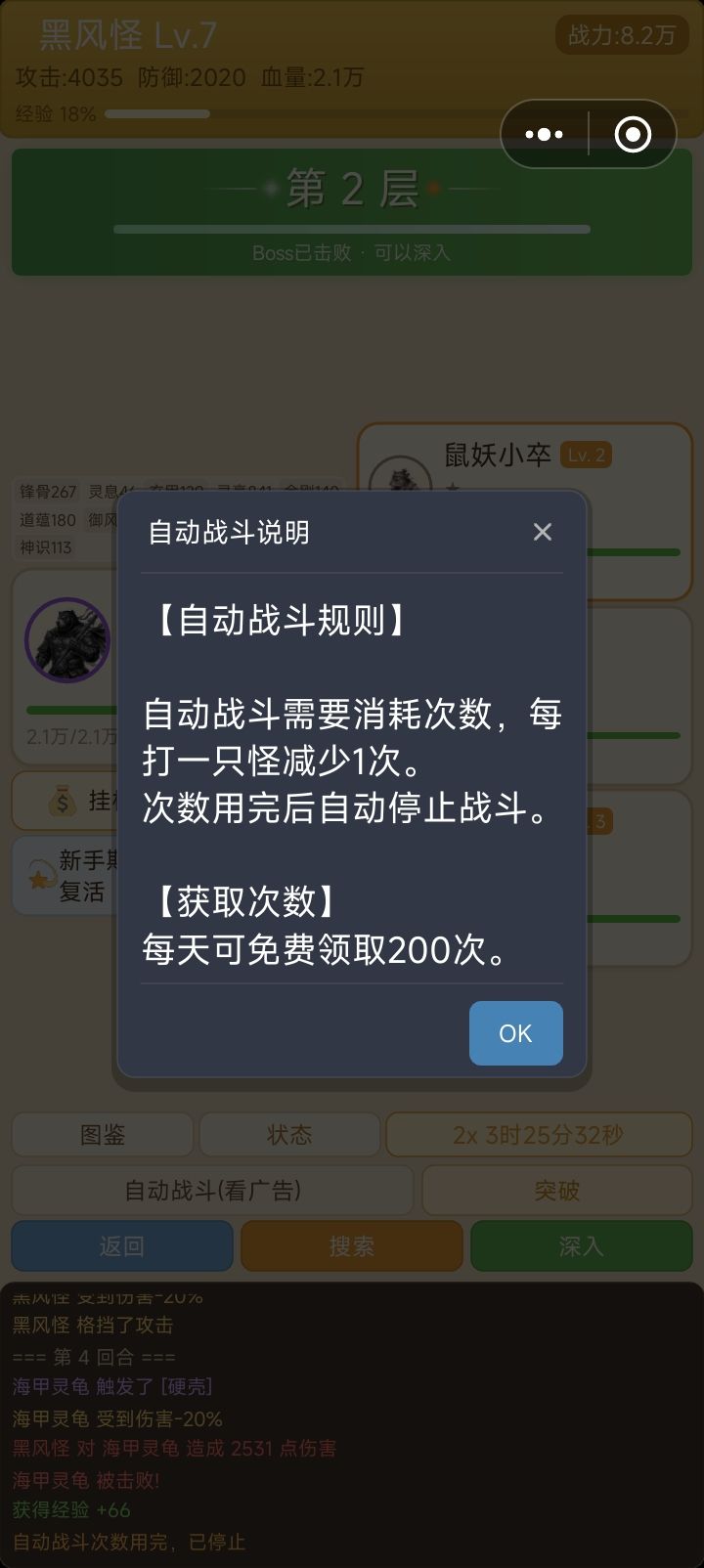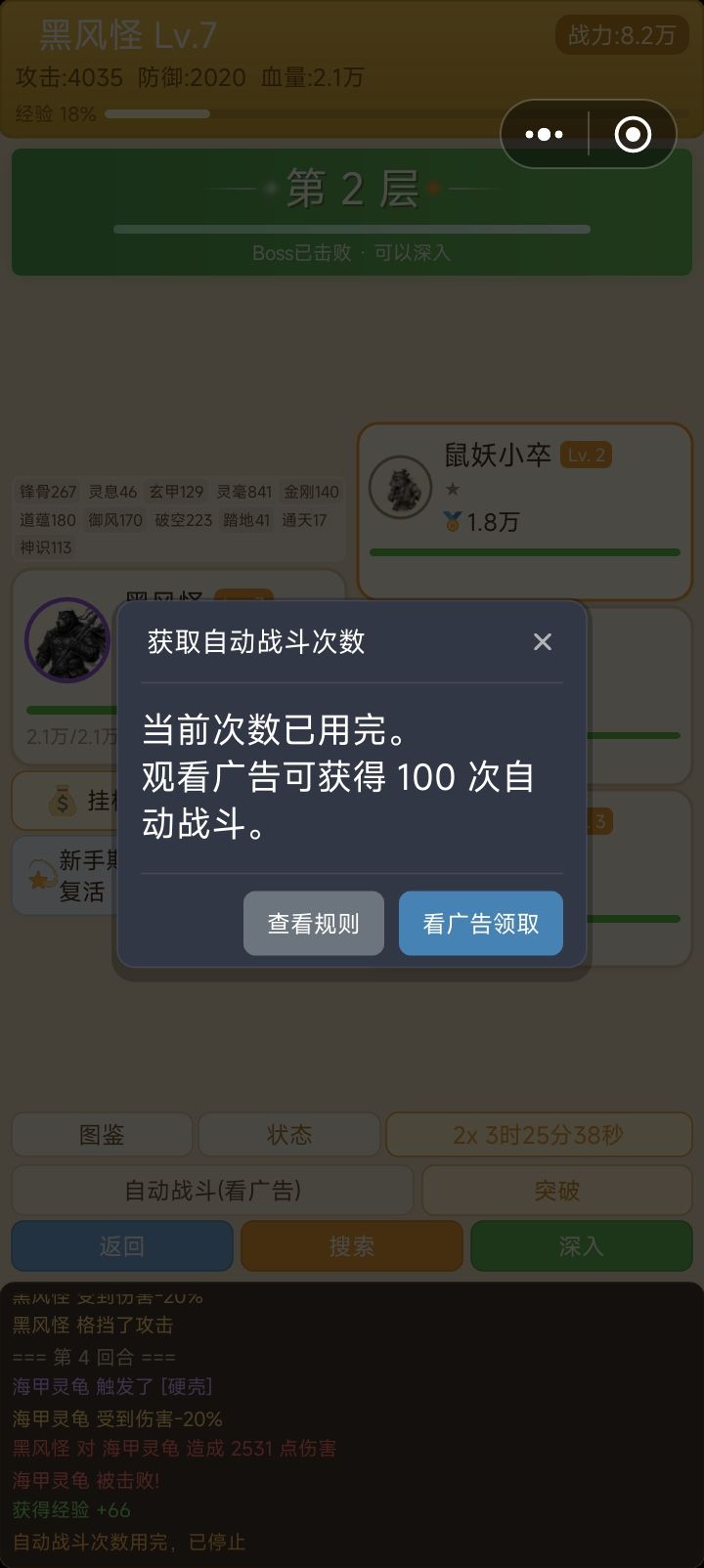 第一次遇到自动战斗还要看广告,看一次广告自动战斗100次,一天可以看100次广告,作者牛逼