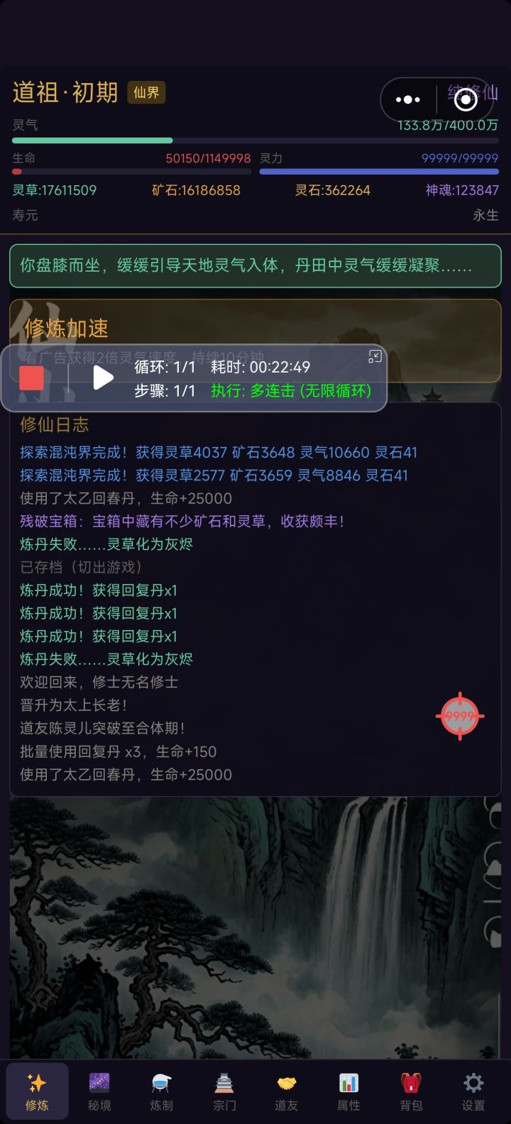 两个问题。第一,所有好友本来还有几十万年寿命,过不了几天突然就寿命无限大,然后暴毙。第二,都修到真仙境了,三万的总血量,能回血的丹药还是只有大还丹,一颗回600血。完全没有一点用,不回血还不行,有很多事件强制扣血,一扣一万多,两三下就死了