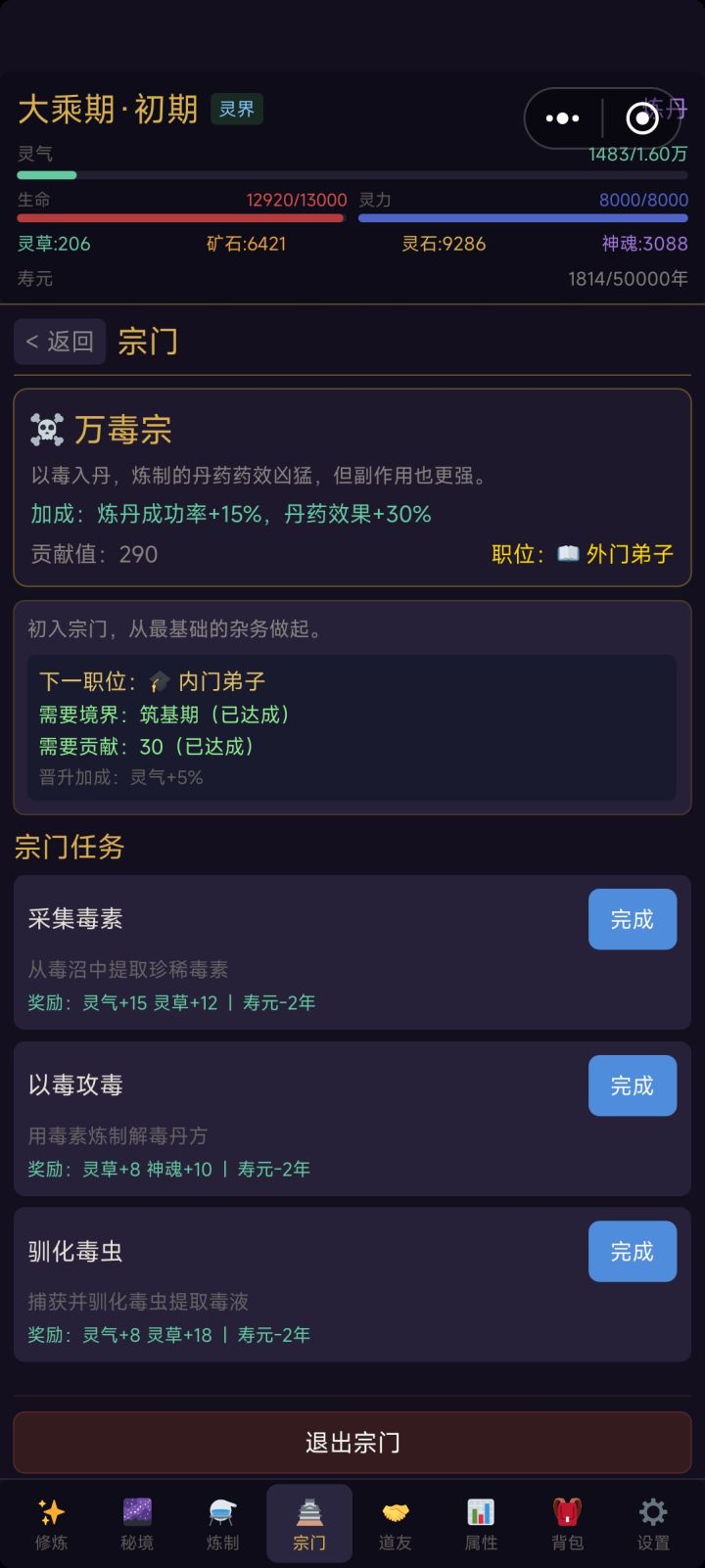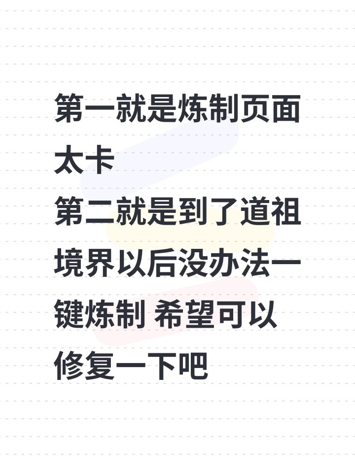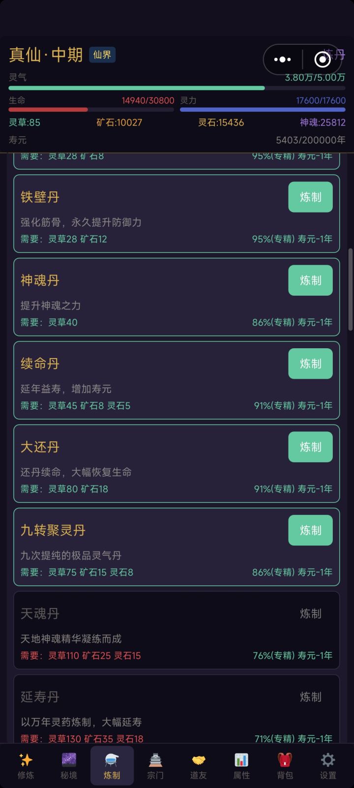 好玩是挺好玩的,但是,还是有很多需要改进的,望采纳1、炼制界面 上下滑动卡顿严重,每炼制一次界面就自己往下滑,炼制同一种丹药或者法宝是就需要再滑回来。 2、一些词汇未标注具体用处 神魂是做什么的?数值高低有什么影响? 3、灵根修炼倍率 废灵根0.5x,普通灵根1.0x,优良灵根1.5x修炼速度,火金灵根就是1.3x修炼速度为什么变慢了? 4、法器装备 为什么就只能装备一件,至少攻击