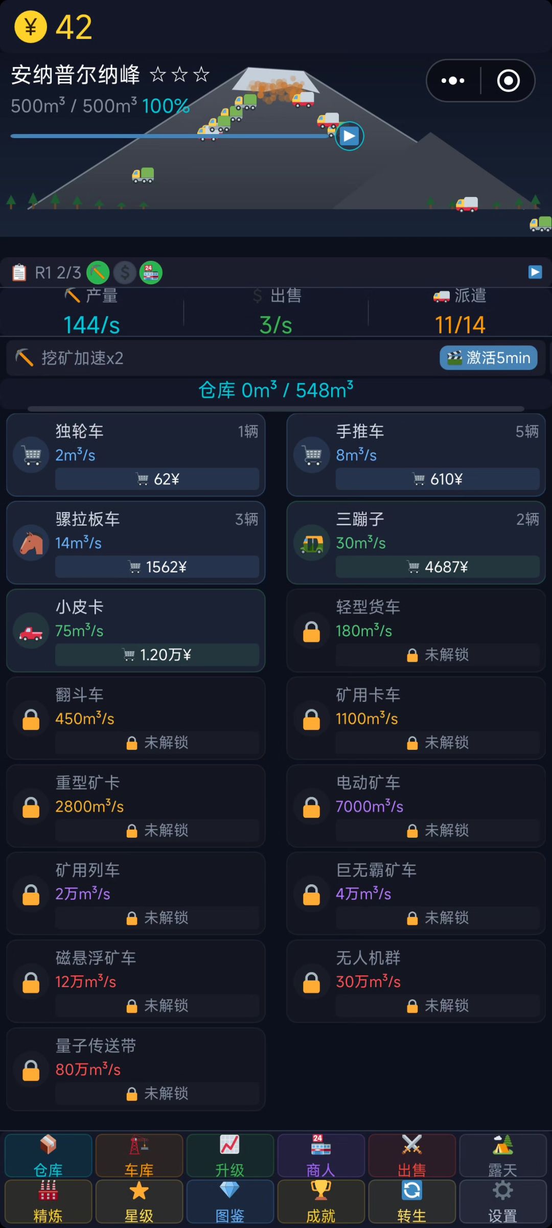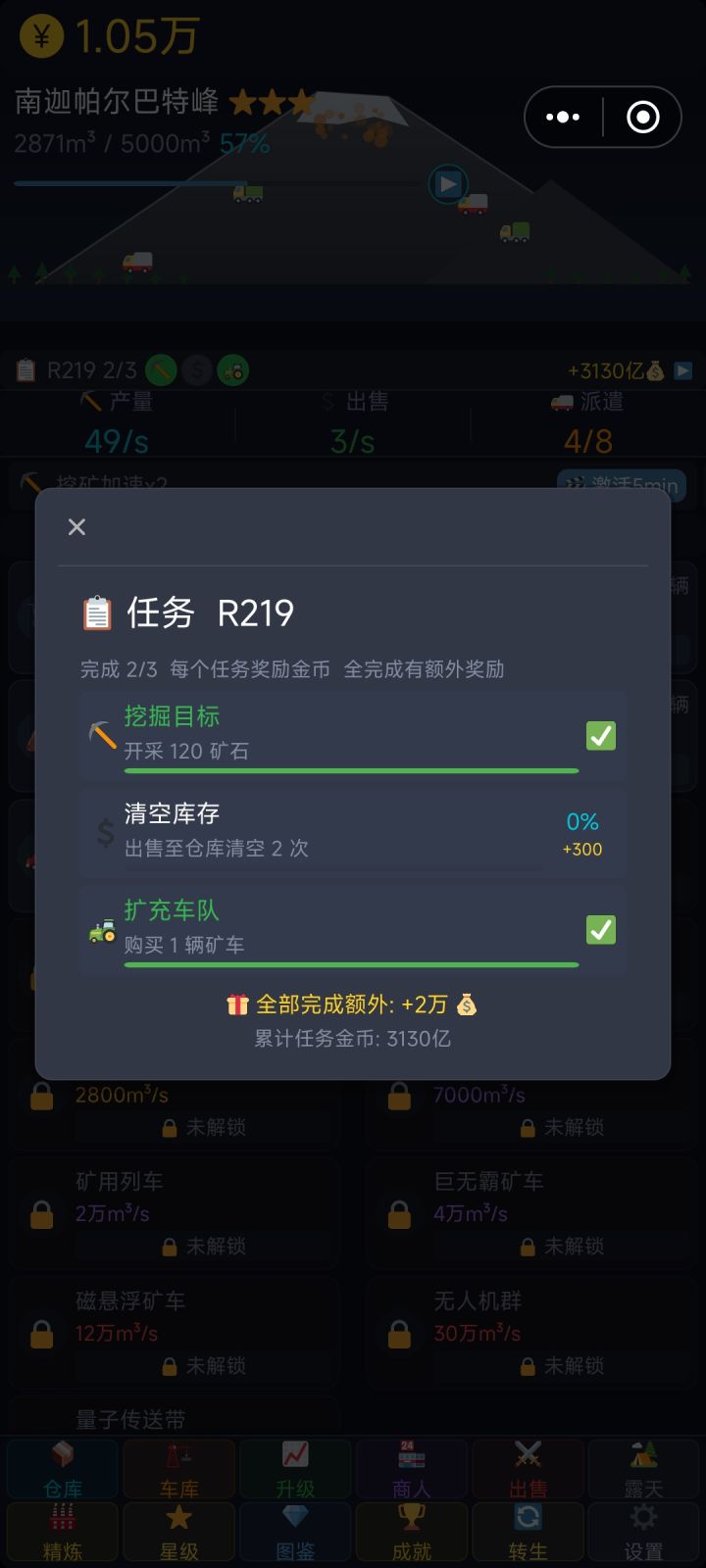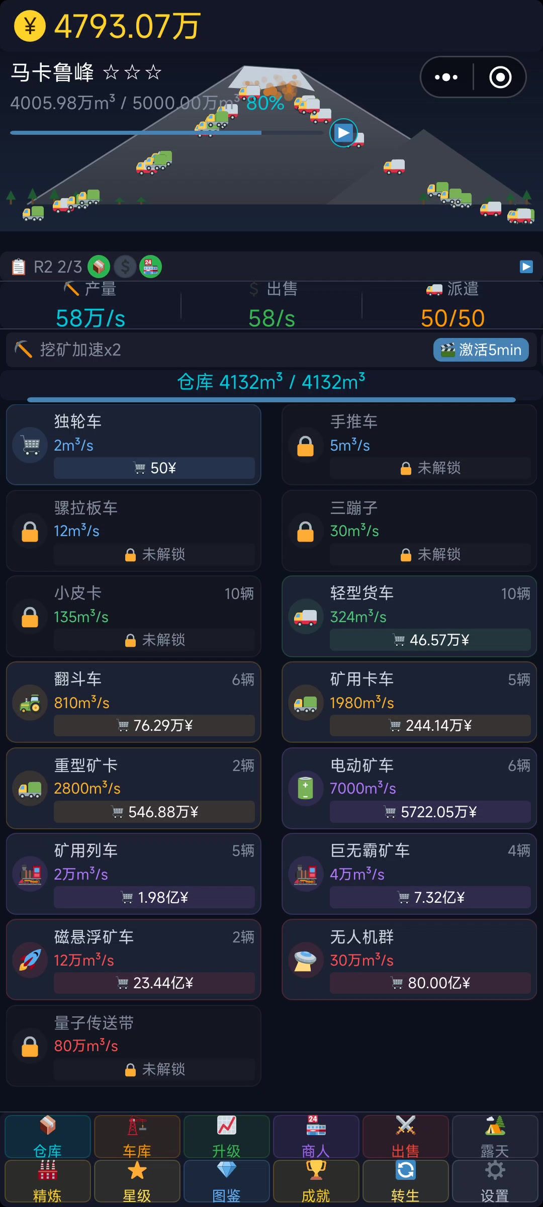 不升级仓库,升级车库,纯任务流,老快了,开满后面60亿一个任务,如果不是商人,后面单独点,他需要划一下才能点一次一把轮做400个任务没问题