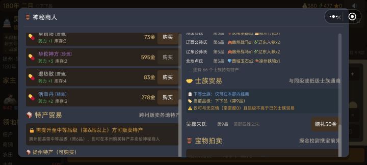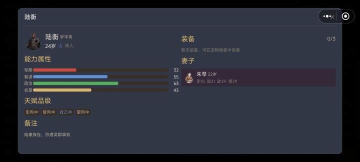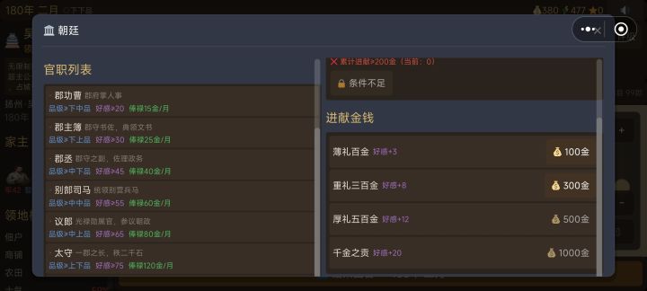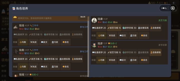 1.攻略方向说白了很简单,初期的核心玩法还是挣钱,攒粮,提高声望,前两者很容易理解。提高声望主要是增加家族品级,品级增加我们就可以在其他郡进行种地开商铺,初期兵力够应付突发时间即可(不考虑家族能力)2.关于后续剧情,玩家们讨论,我看主要是战争和生子的议论,首先目前战争系统还不够完善,只能说文字战争吧,有点像三国志系列后期游戏那样,到这步就可以平推天下,后续肯定要完善,但我目前没有喧宾夺主的想法